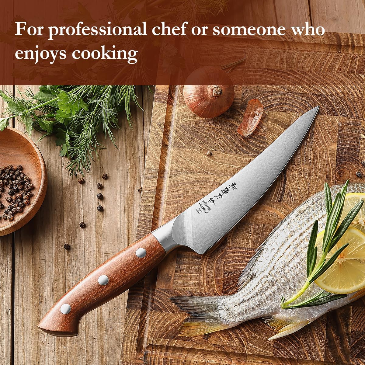 • 【Hochwertiges Klingenmaterial】Hergestellt aus Deutschland DIN1.4116 Stahl in hohem Kohlenstoff, bessere Härte, Schärfe und Haltbarkeit. Die Klinge hat starke Korrosionsbeständigkeit und Zähigkeit nach feiner Verarbeitung. Geeignet für den