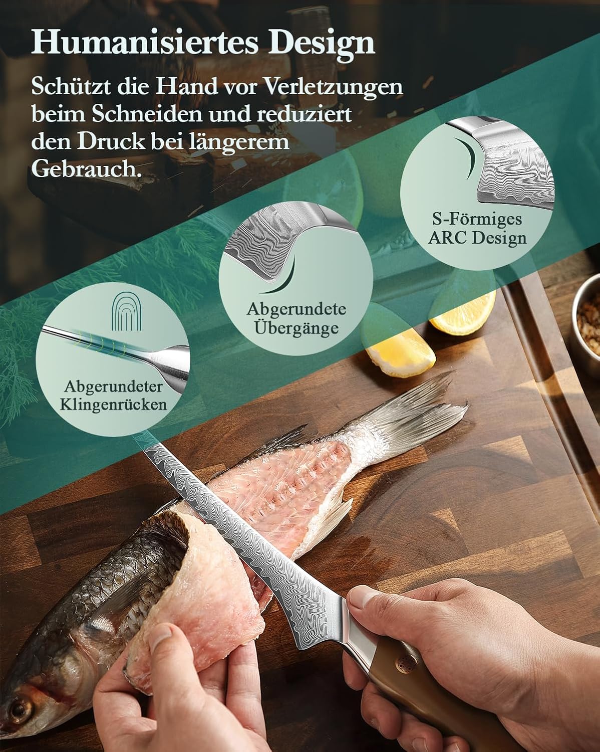 - Multifunctional Filetiermesser : Angemessene Dicke des Messerrückens, Geeignet zum Entbeinen, Entschuppen, Filetieren, Enthäuten, Trimmen oder zur Bearbeitung von Fisch und Geflügel.