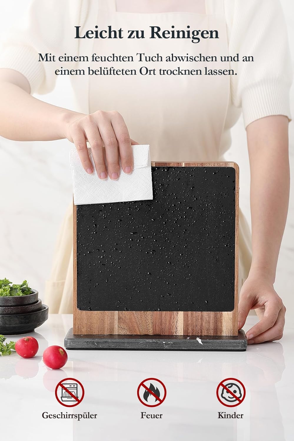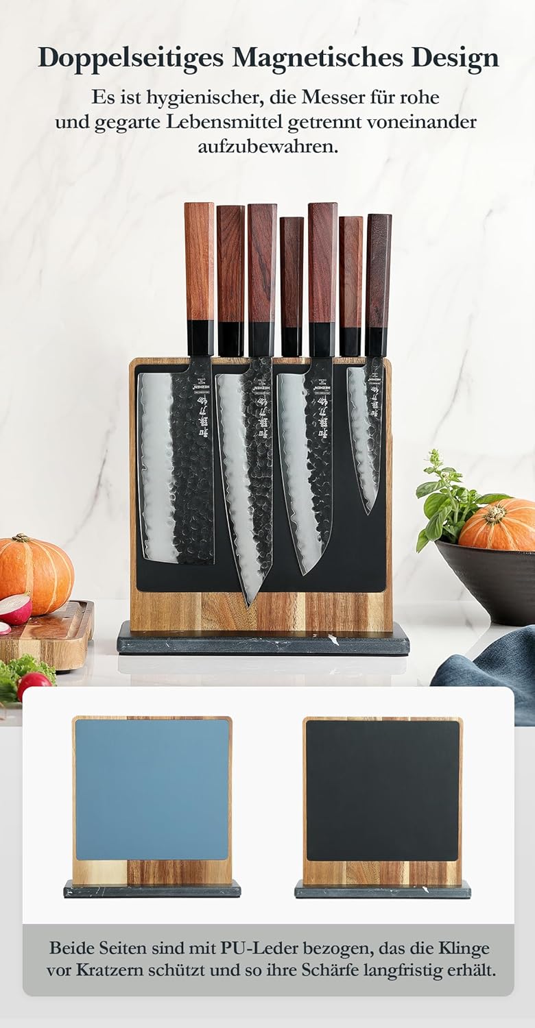 • Doppelseitiger Magnetischer Messerhalter : Unser Halter verfügt über doppelseitiges Design mit leistungsstarken Magneten. Sie können die Messer für rohe Lebensmittel und gekochte Lebensmittel auf verschiedenen Seiten getrennt halten, was hygienischer