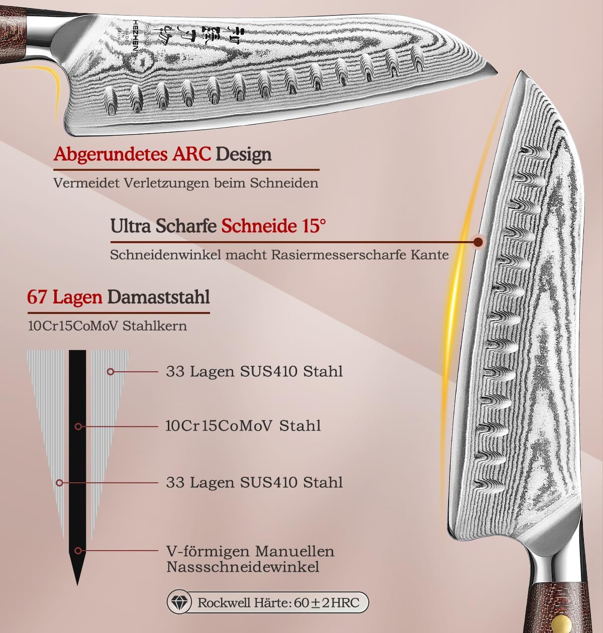 - 67 Lagen Damaszenerstahl : Echtes Damastmesser, nicht lasergraviert. Customized 10Cr15CoMoV Stahlkern mit stabiler Rockwell-Härte von 60±2HRC nach Vakuum-Tiefkühl-Wärmebehandlung. Chinesische VG10, ein ähnliches Verhältnis zu Japan VG10.