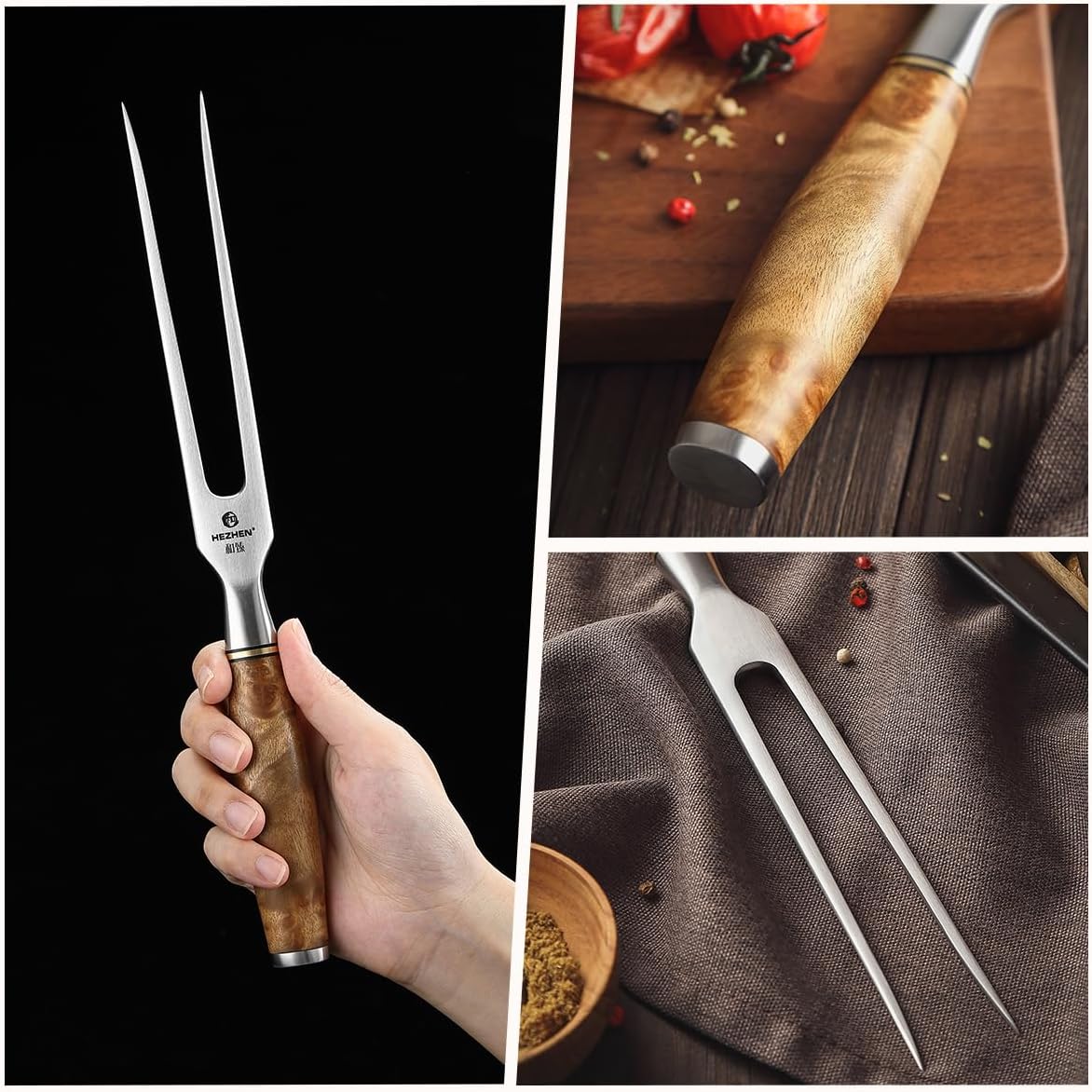 HEZHN Tranchiergabel Fleischgabel Outdoor Grillgabel 430 Edelstahl Figaro Bergahorn Holz Geschenkbox