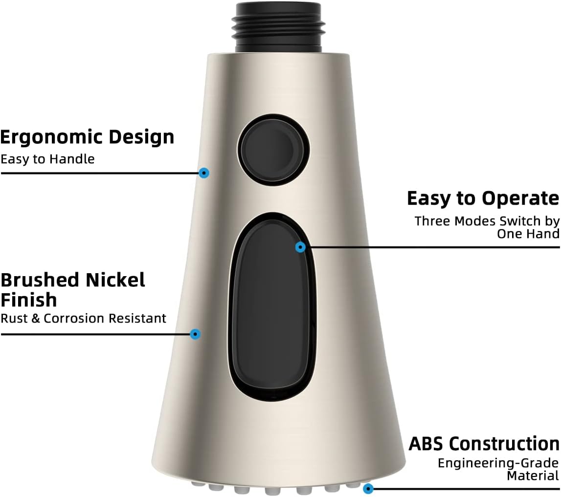 - Der herunterziehbare Kopf ist von guter Qualität und tropft nicht. Dieser Ersatz-Wasserhahn ist aus technischem Kunststoff (PC/ABS). Gebürstetes Nickel-Finish des herausziehbaren Sprühkopfes widersteht täglichem Rost effektiv, was Qualität und