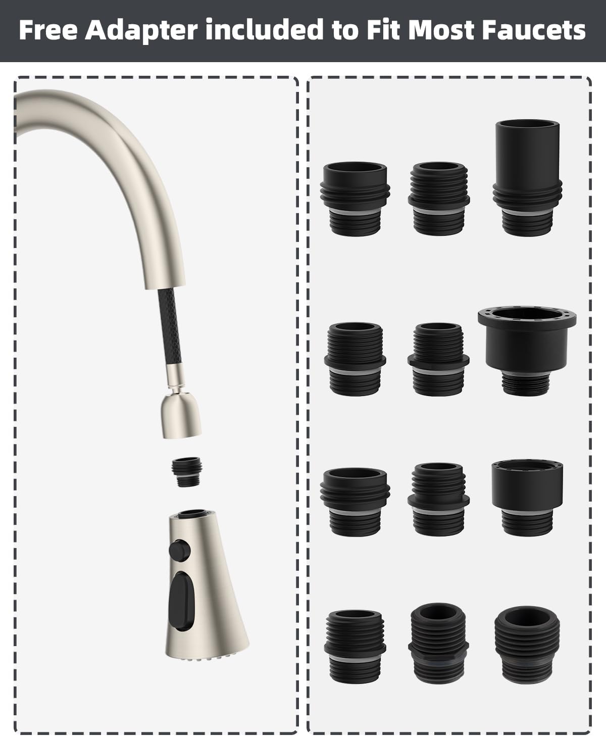 - Abnehmbarer und waschbarer Wasserhahn-Belüfter. Der Ersatz-Wasserhahnkopf wird mit einem abnehmbaren Wasserhahn-Luftsprudler geliefert. Der Innenbelüfter mit mehreren Netzen erzeugt einen perfekten belüfteten Strahl, leise, spritzwassergeschützt,