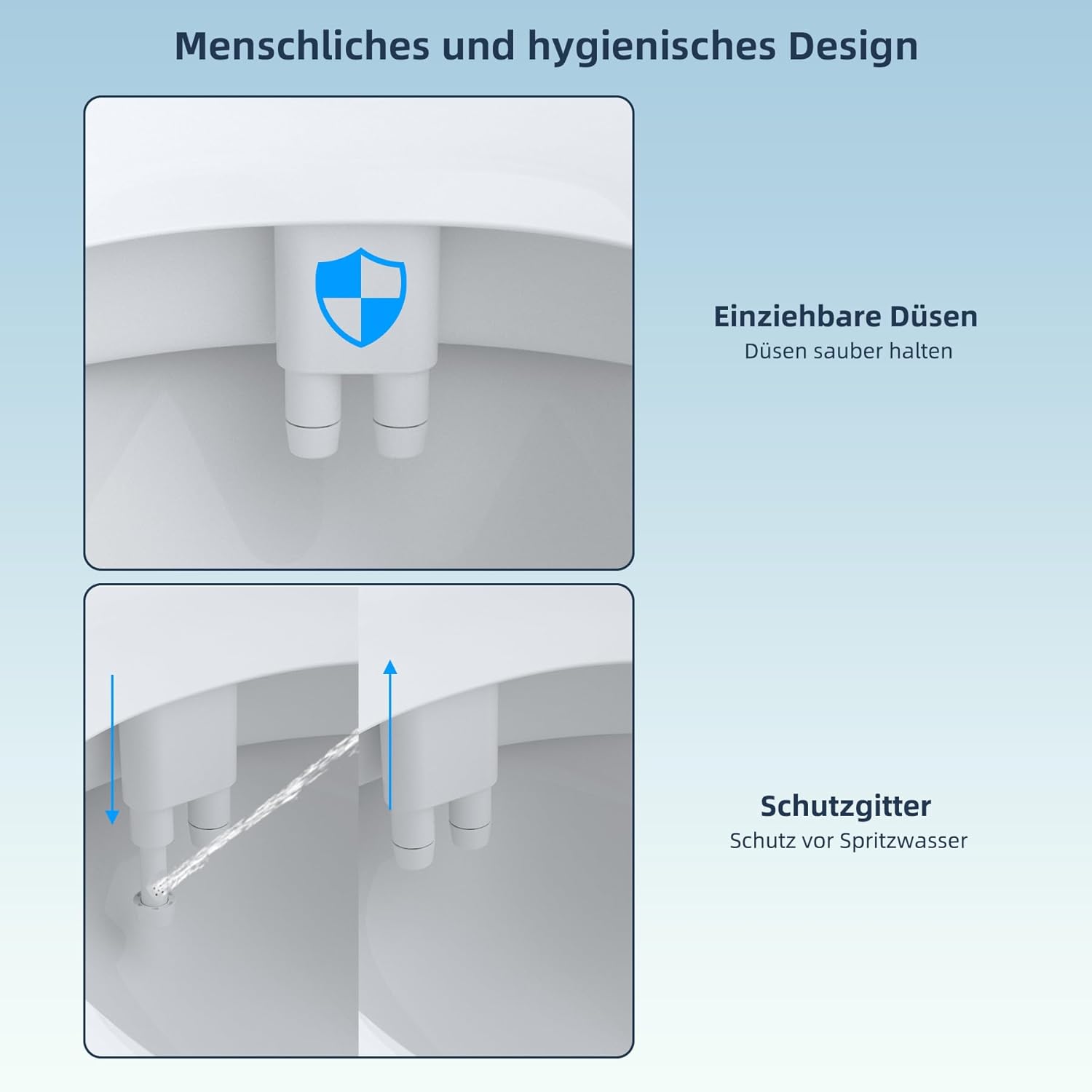 - 【Düsenklappenschutz & ausziehbare Düse】Die Düse zieht sich automatisch nach der Nutzung zurück und das hygienische Düsenklappenschutz schützt die Düse vor Schäden durch äussere Einwirkungen während der Benutzung der Toilette. Der