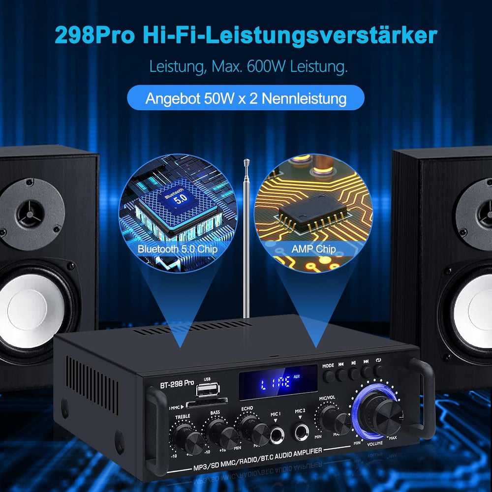 • Upgrade-Version BT-298Pro Digitaler Audioverstärker: Vollständig aktualisiertes Design, 50W+50W Nennleistung, perfekt geeignet für 4-16 Zoll Passivlautsprecher. Funktionserweiterung, Hinzufügen einer Mikrofonbuchse. Ausserdem ist die Klangqualität