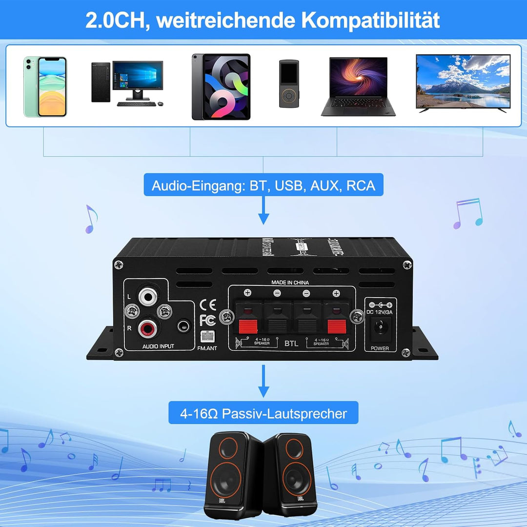 • HiFi-Stereo-Verstärker: 2.0-Kanal-Digital-Verstärker kann 40Wx2 Nennleistung, 300Wx2 P.M.P.O (Peak Music Power Output), mit leistungsstarken Audio-Verarbeitung Chip, Verzerrung Rate: 0,5%, Signal-Rausch-Verhältnis: 85db, starke