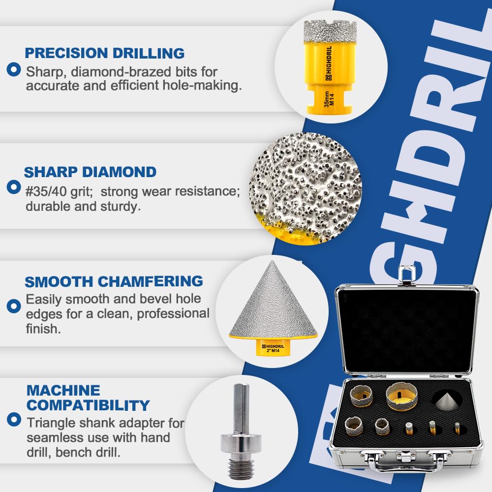 - ✔️【Einzelheiten】8 Stück vakuumgelötete Diamant-Kernbohrer mit M14 Gewinde, 6/8/10/20/25/35/50mm, jede Grösse 1 Stück + 1 Stück 50mm Fasenbohrer.