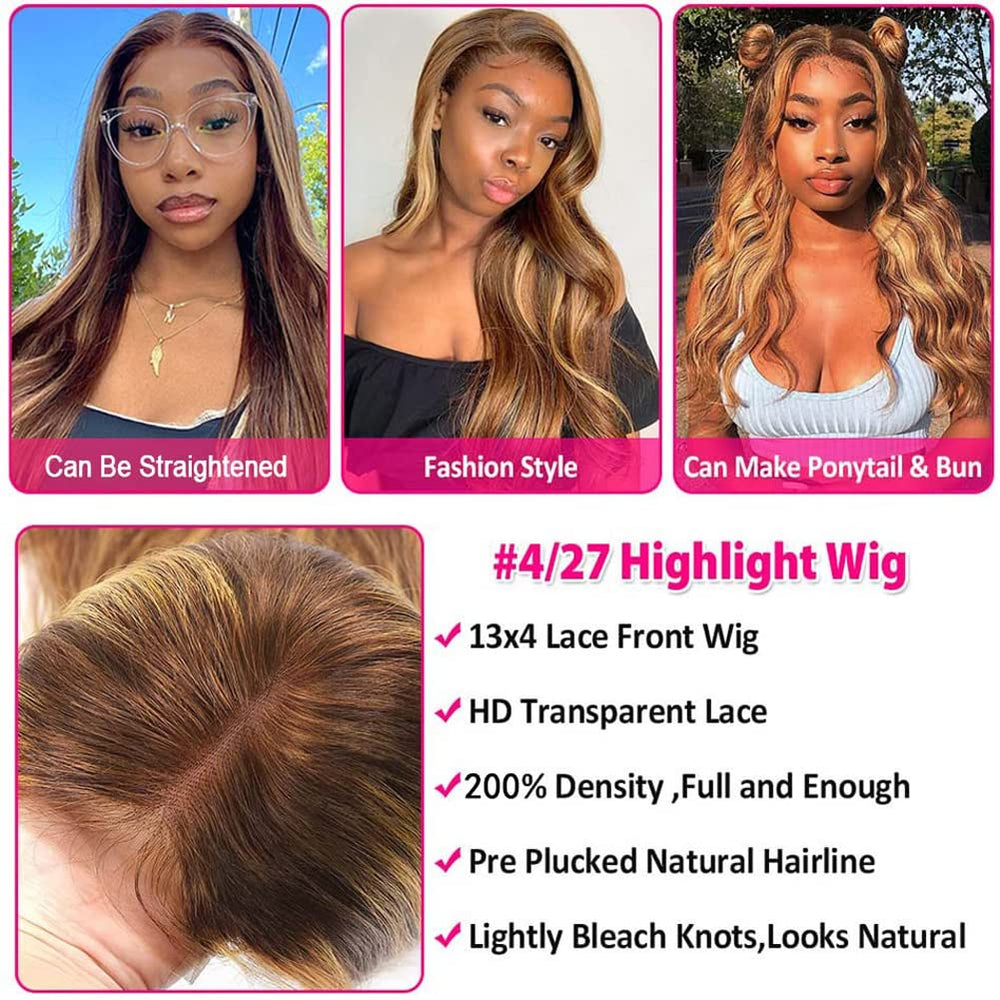 - 🌈Highlight Honey Blonde Frontal Wigs Human Hair Hd Lace Package:1Pc Body Wave Highlight 4/27 Color Human Hair Wig With 2Pc Wig Cap With Velvet Lace Wig Grip,Perfect For Girls With Small Heads