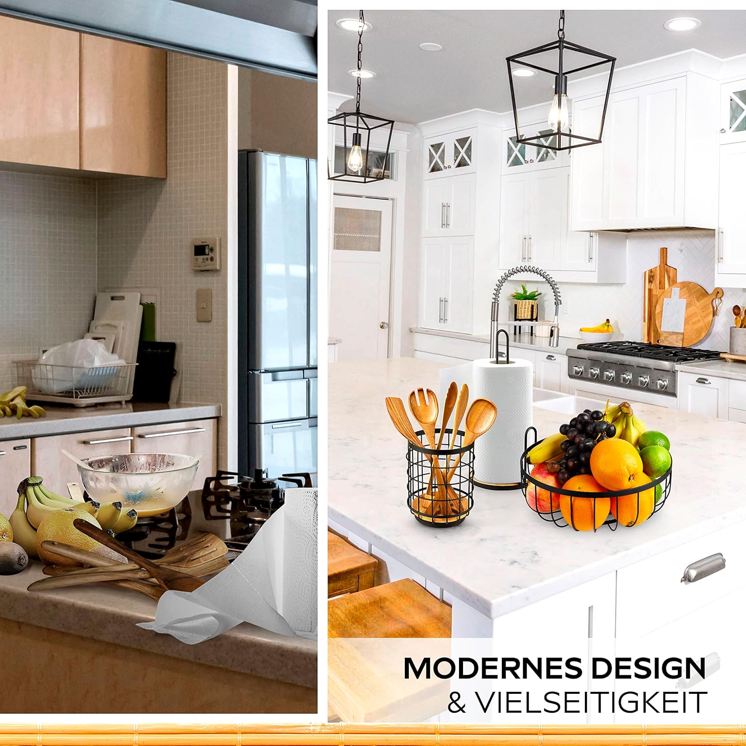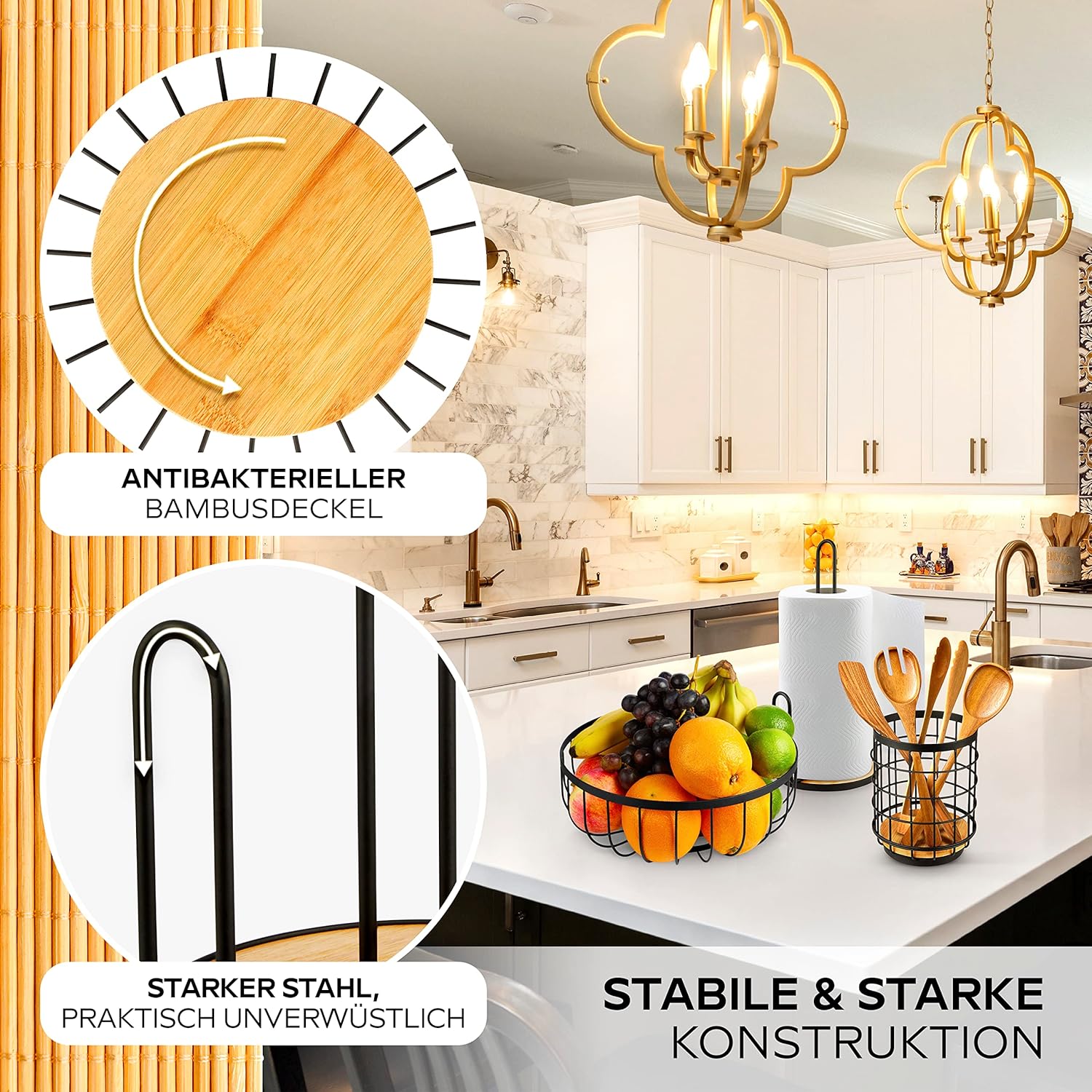 - HIKITCHEN [3er Set Obstkorb Obstschale Küchenrollenhalter Küchenutensilienhalter Utensilienhalter Küche Küchenhelfer Aufbewahrung Dekoschale schwarz Metall Bambus