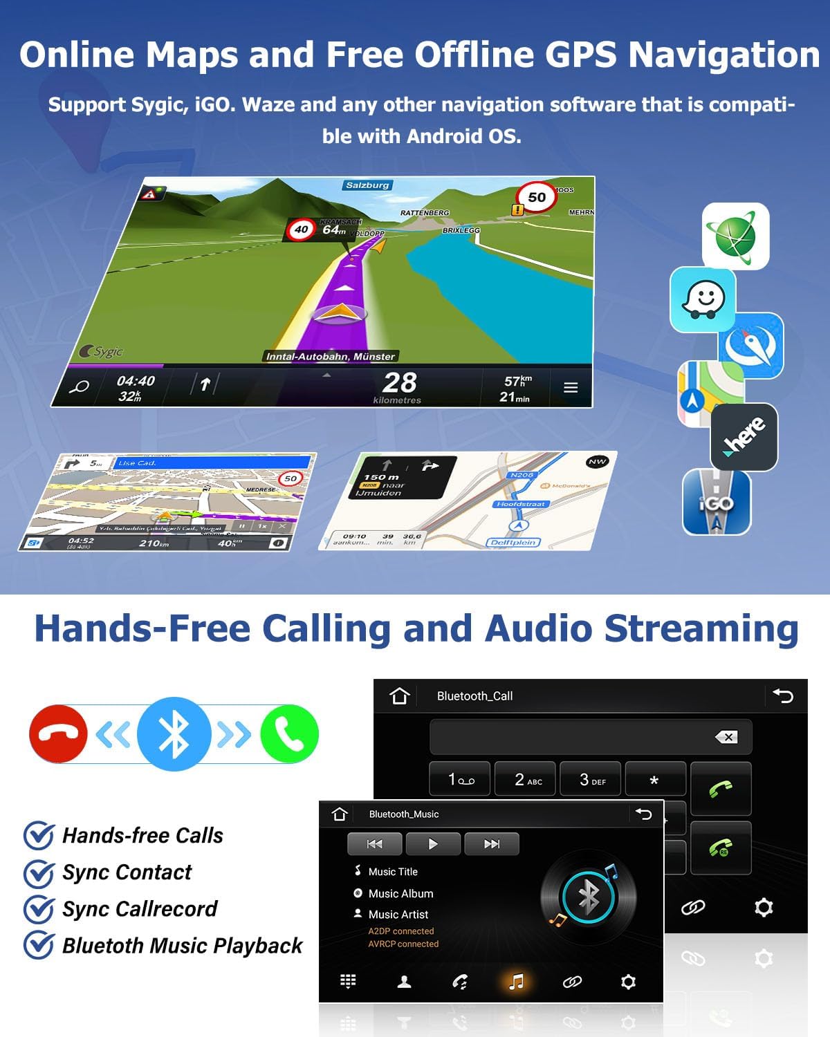 - Mirror Link für iOS/Android: Dieses Bluetooth-Autoradio unterstützt über Original-USB-Kabel, können Sie Ihr Telefon Seite auf dem HD-Touchscreen dieses Auto Bluetooth-Radio mit Satellitennavigation synchronisieren. Android unterstützt