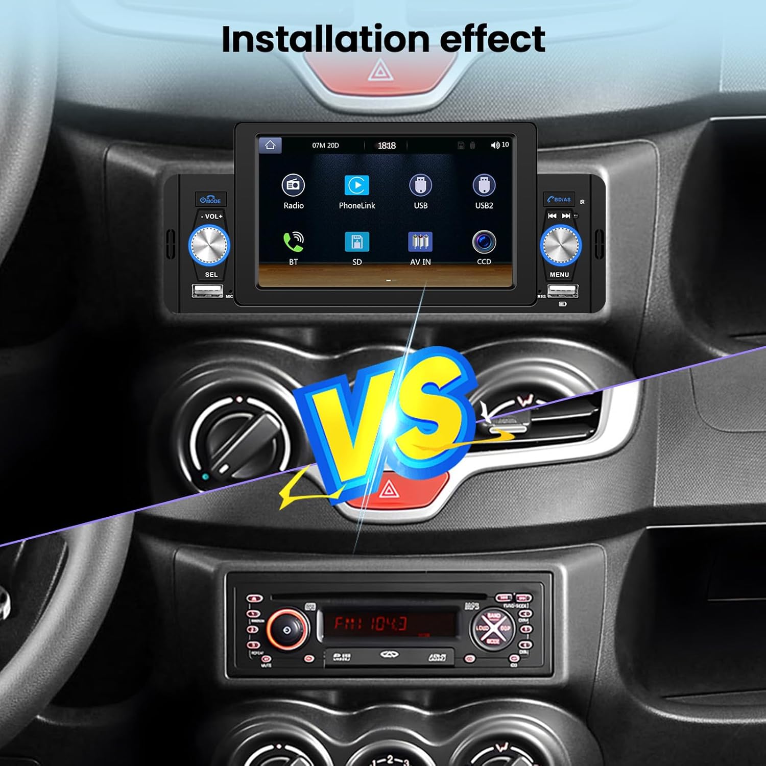 - 【5 Zoll Single Din Touchscreen Radio】Autoradio 1 din ist mit einem kapazitiven 5 Zoll HD Bildschirm mit 7 farbiger Hintergrundbeleuchtung ausgestattet, um Ihre individuellen Bedürfnisse zu erfüllen. Kommt mit zwei USB Anschlüssen, einer für das schnelle Aufladen des Telefons und einer für die Datenübertragung.