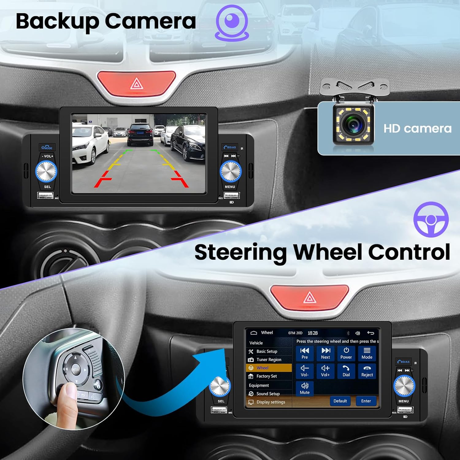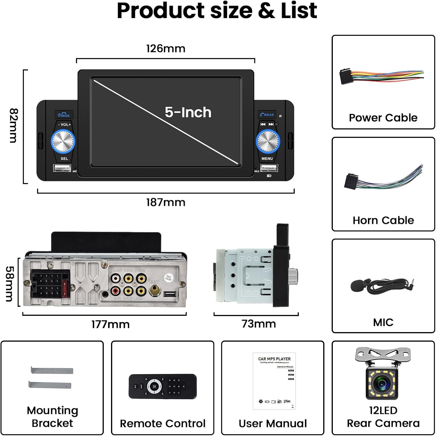 - 【Carplay Radio mit Rückfahrkamera】 5 Zoll Single Din Autoradio mit 12 LED Rückfahrkameras, 170° Weitwinkelobjektiv, klare Nachtsicht, IP69 wasserdicht. Wenn das Auto den Rückwärtsgang einlegt, erscheint automatisch der Bildschirm der Rückfahrkamera auf dem 5 Zoll Touchscreen.