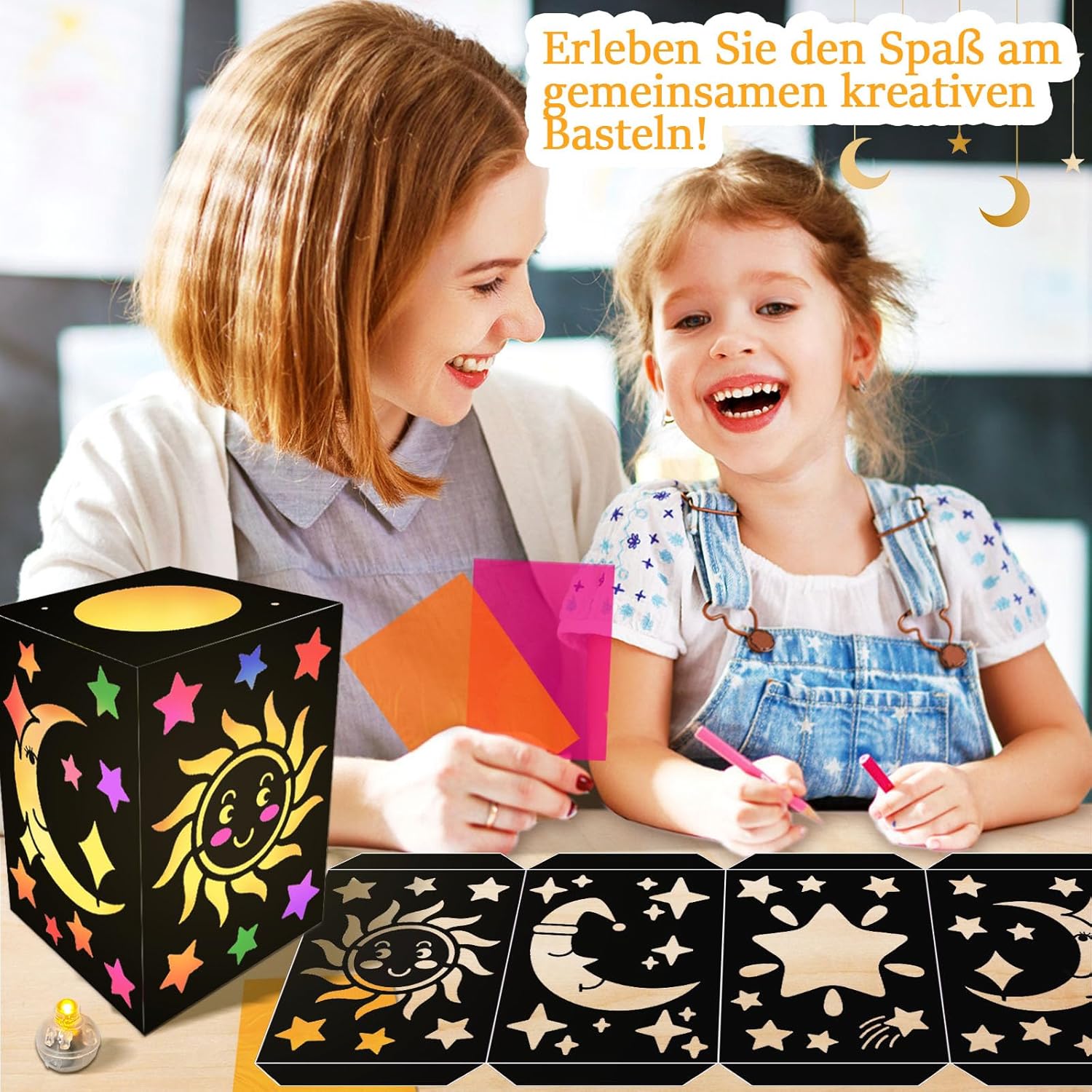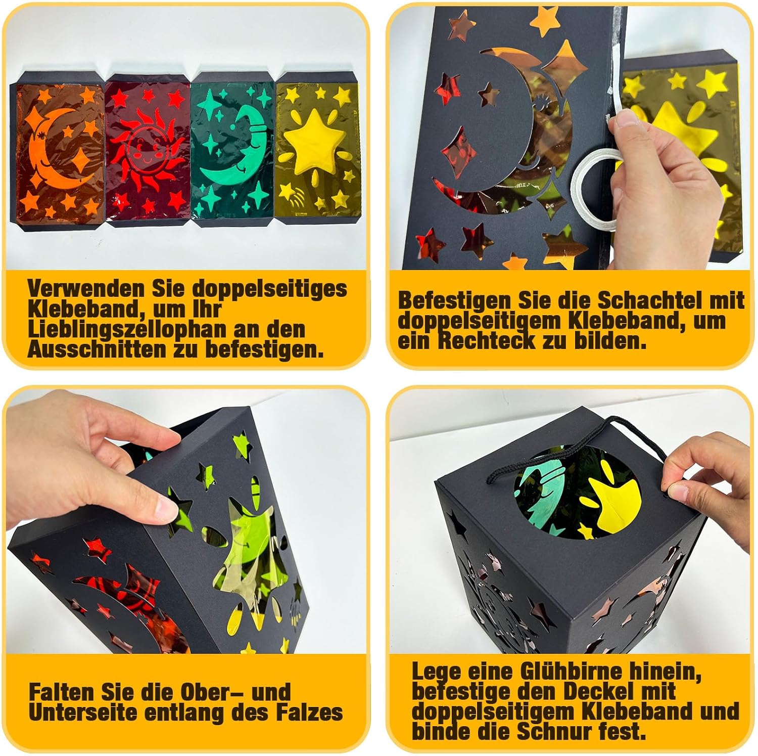 - Einfaches Basteln für Kinder: Unser Laternen Bastelsets Kinder ist sehr einfach zusammenzubauen. Wählen Sie Ihre Lieblingsfarbe des Zellophans, kleben Sie es auf die Innenseite der Laterne, falten Sie die Laterne (wie eine Geschenkverpackung), fügen