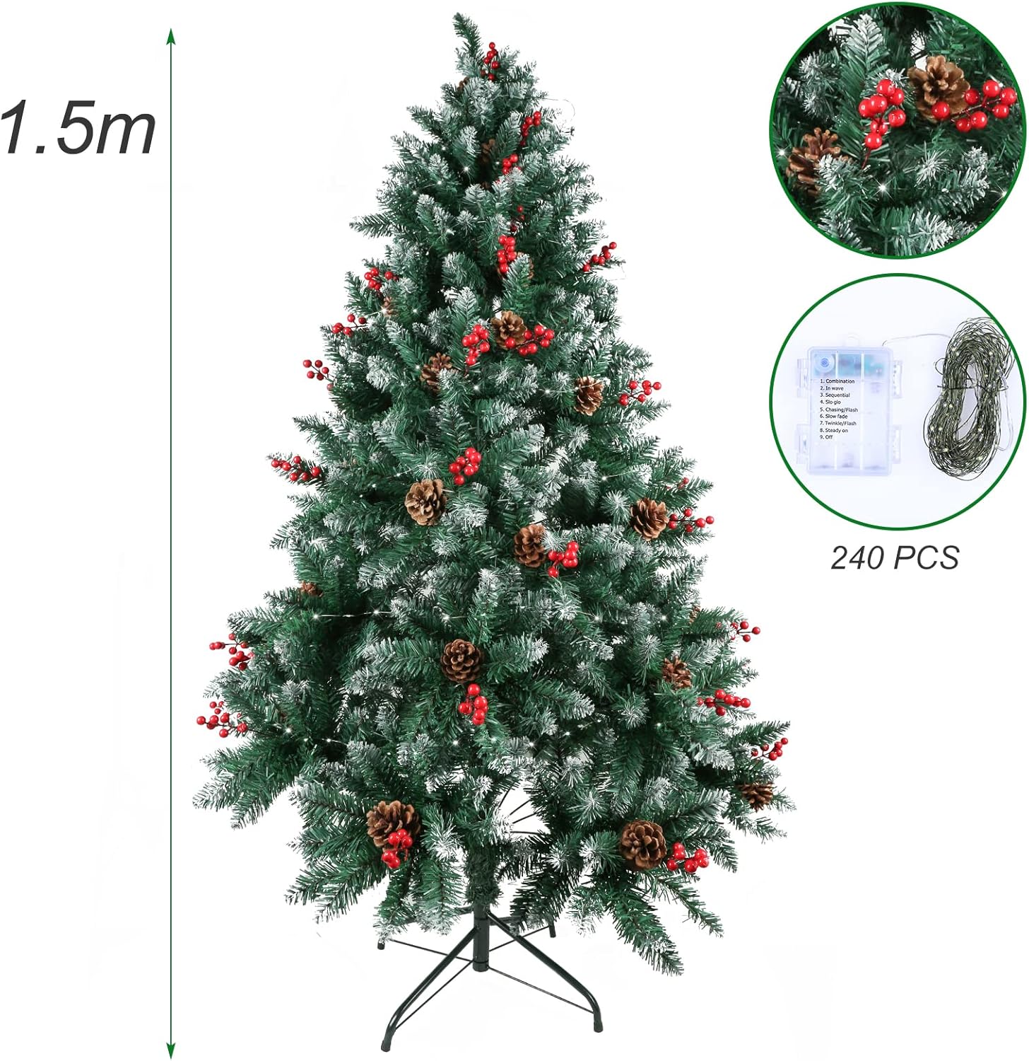 - Vordekoriertes Design: Tannenzapfen, rote Früchte und imitierte Schneeflocken auf teilweise beflockten Zweigen sorgen für einen natürlichen Look. Warme Kupferdraht-Lampen sorgen für eine festliche Atmosphäre und machen ihn zu einer herausragenden