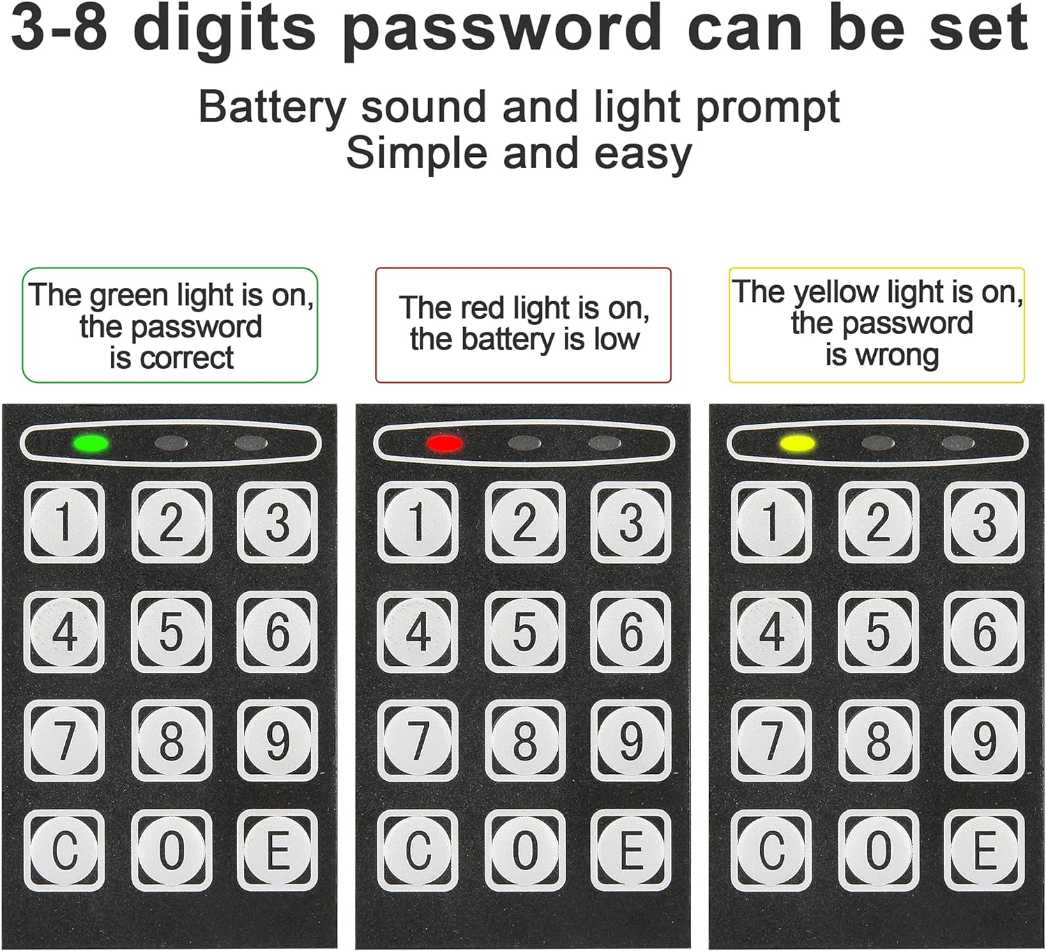 - [3-fache Sicherheit]: 2 starke Stahlbolzen mit einem doppelten Bolzenschloss mit einem sicheren 3- bis 8-stelligen Zahlencode, 3 falsche Eingaben des Codes lösen einen Alarmton aus und halten die Zahlentastatur verschlossen. Wenn Sie den Code vergessen