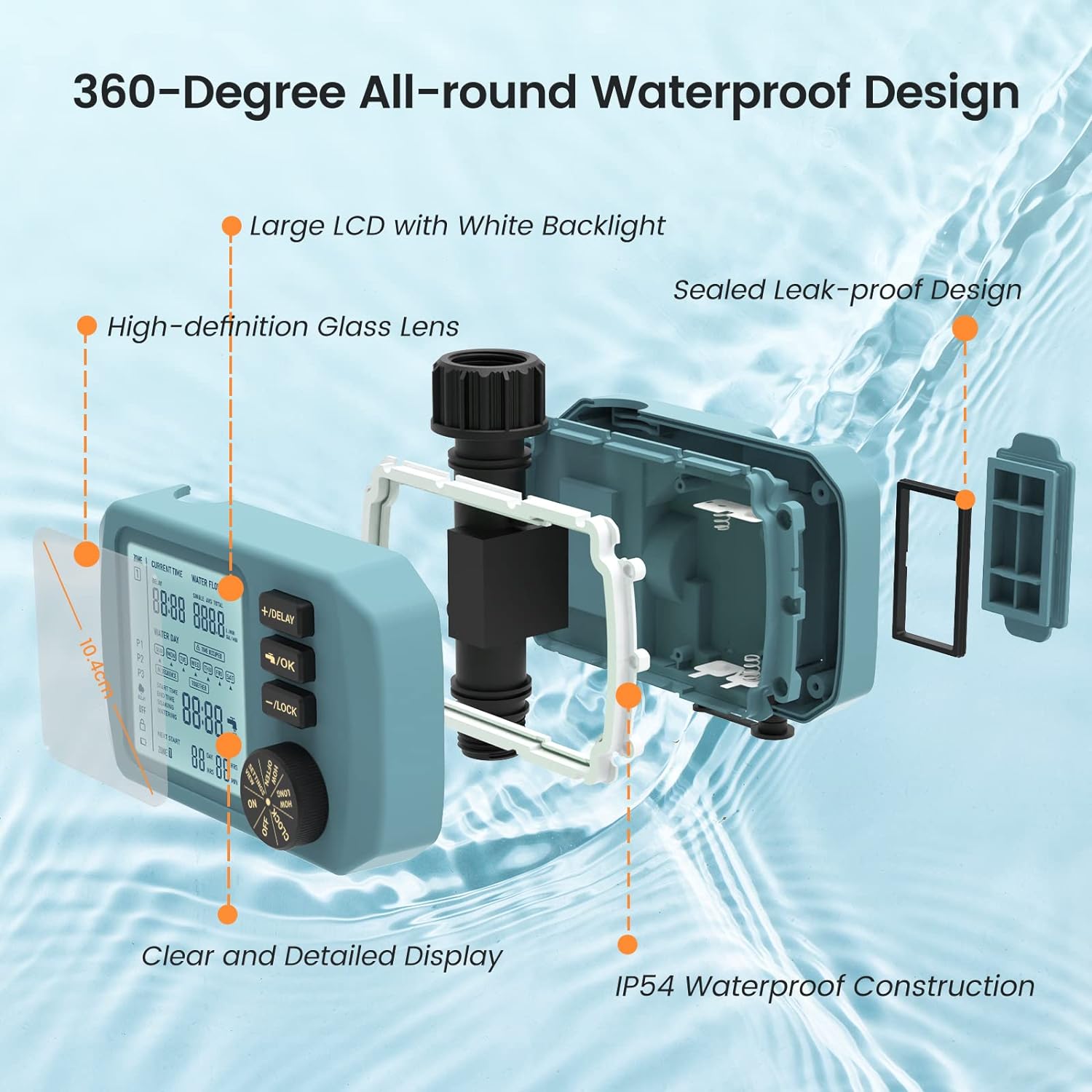 - Regenverzögerung & Kindersicherung: Die Bewässerung an Regentagen kann um 24 Stunden / 48 Stunden / 72 Stunden verzögert und dann automatisch wieder aufgenommen werden, wodurch eine übermässige Bewässerung an Regentagen effektiv vermieden wird.