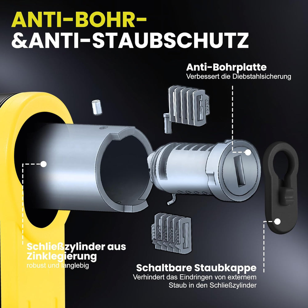 - Verbesserte Sicherheitsmerkmale: Das HIPARK fahrradschloss verfügt über eine Staubkappe, die das Eindringen von Staub und kleinen Partikeln in den Schliesszylinder wirksam verhindert. Dies gewährleistet einen reibungslosen Betrieb und verlängert die