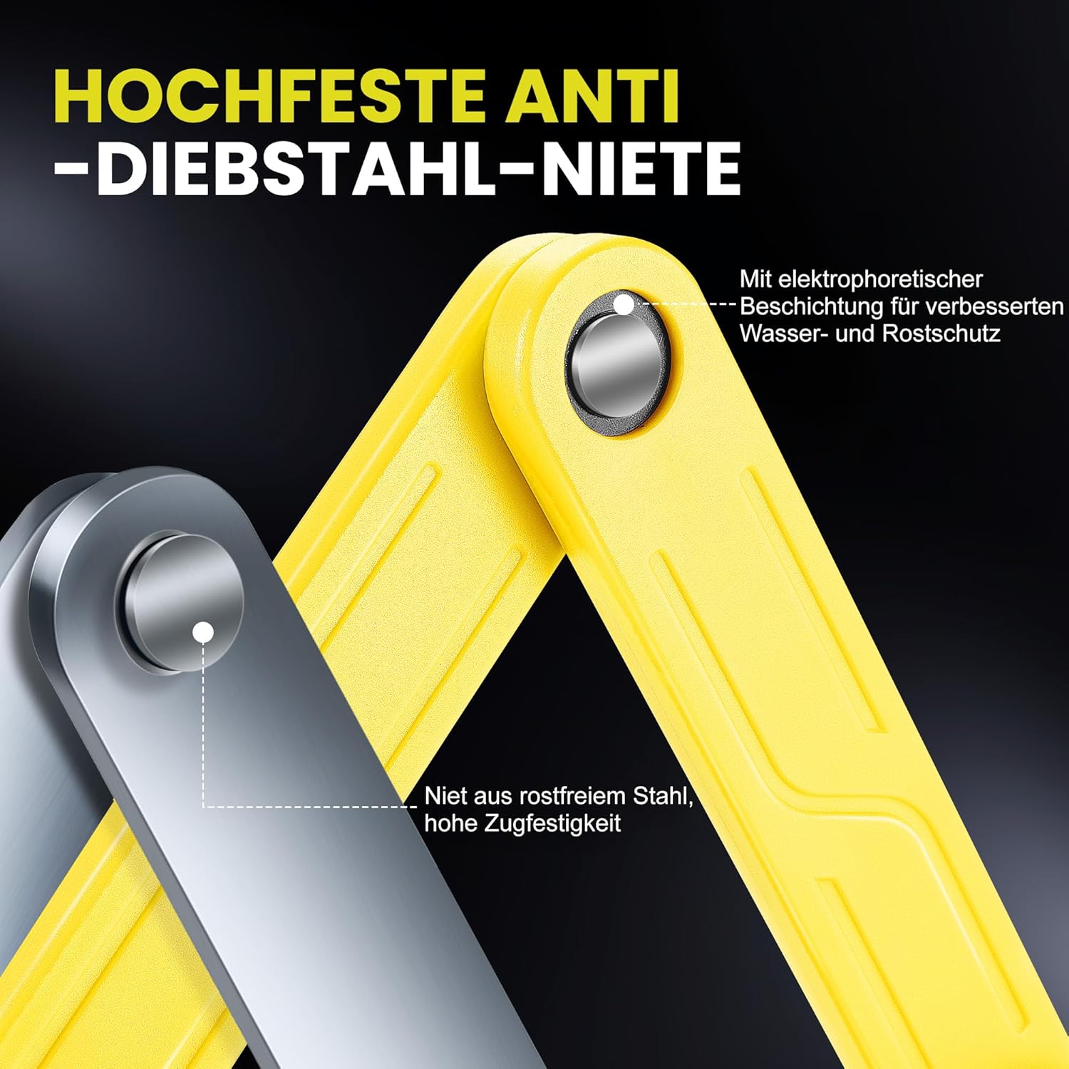 - Robuste und flexible Nieten: Bei diesem fahrradschloss hohe sicherheit wird ein Schliesszylinder aus einer Zinklegierung verwendet, der eine hervorragende Schlag- und Korrosionsbeständigkeit bietet. Die Edelstahlnieten sind mit einer elektrophoretischen
