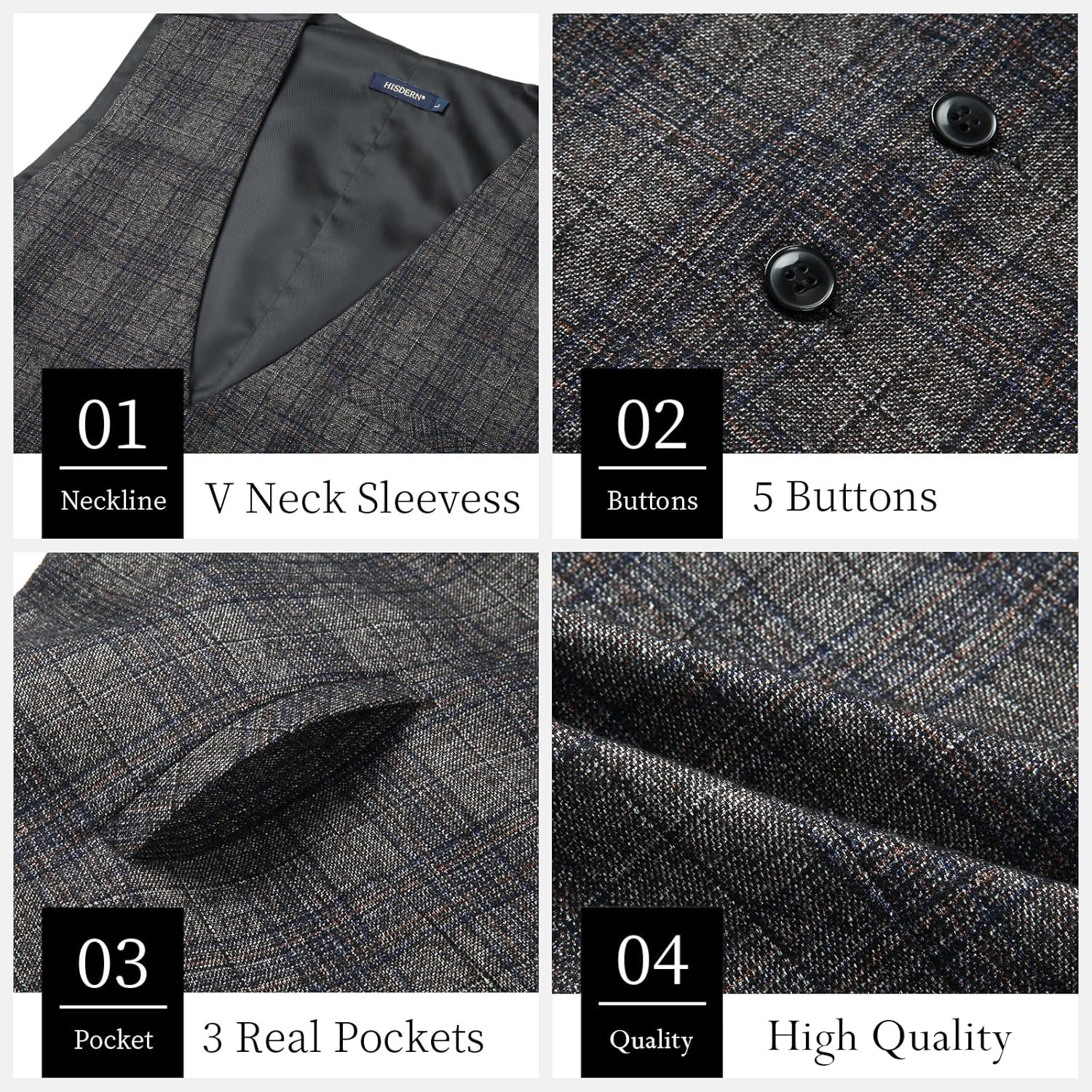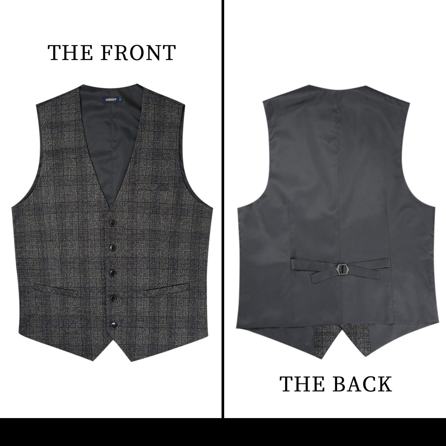 - Karierte Weste Eigenschaften: V-Ausschnitt + 3 echtes Einstecktuch + 5 Knöpfe + verstellbarer Rückengurt. Der Rückenriemen lässt sich mit der Metallschnalle leicht bewegen und einstellen, die Nähte sind versteckt und fest und die Passform ist gut.