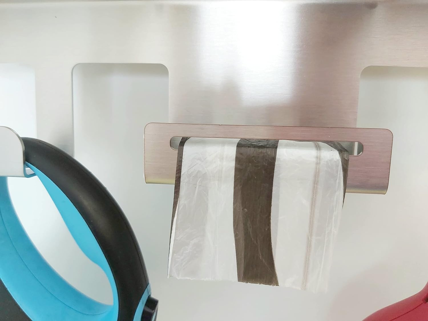- Lieferumfang: Ein Halter mit zwei Halterungen, Beutelfach und Befestigungsschrauben.