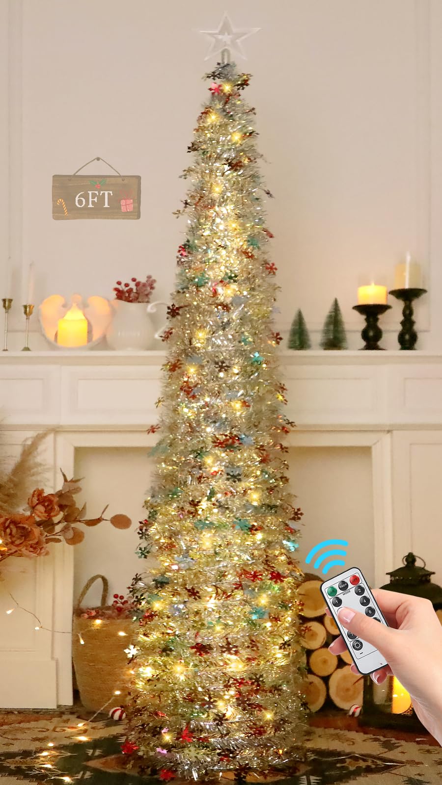 - 6 Fuss POP UP TLAMETTA WEIHNACHTSBAUM MIT LICHTERN: HMASYO künstlicher schlanker Weihnachtsbaum ist mit schimmernden kreisförmigen Pailletten und warmweissen Lichtern beladen. Lametta-Zweige reflektieren das Licht und erzeugen eine funkelnde