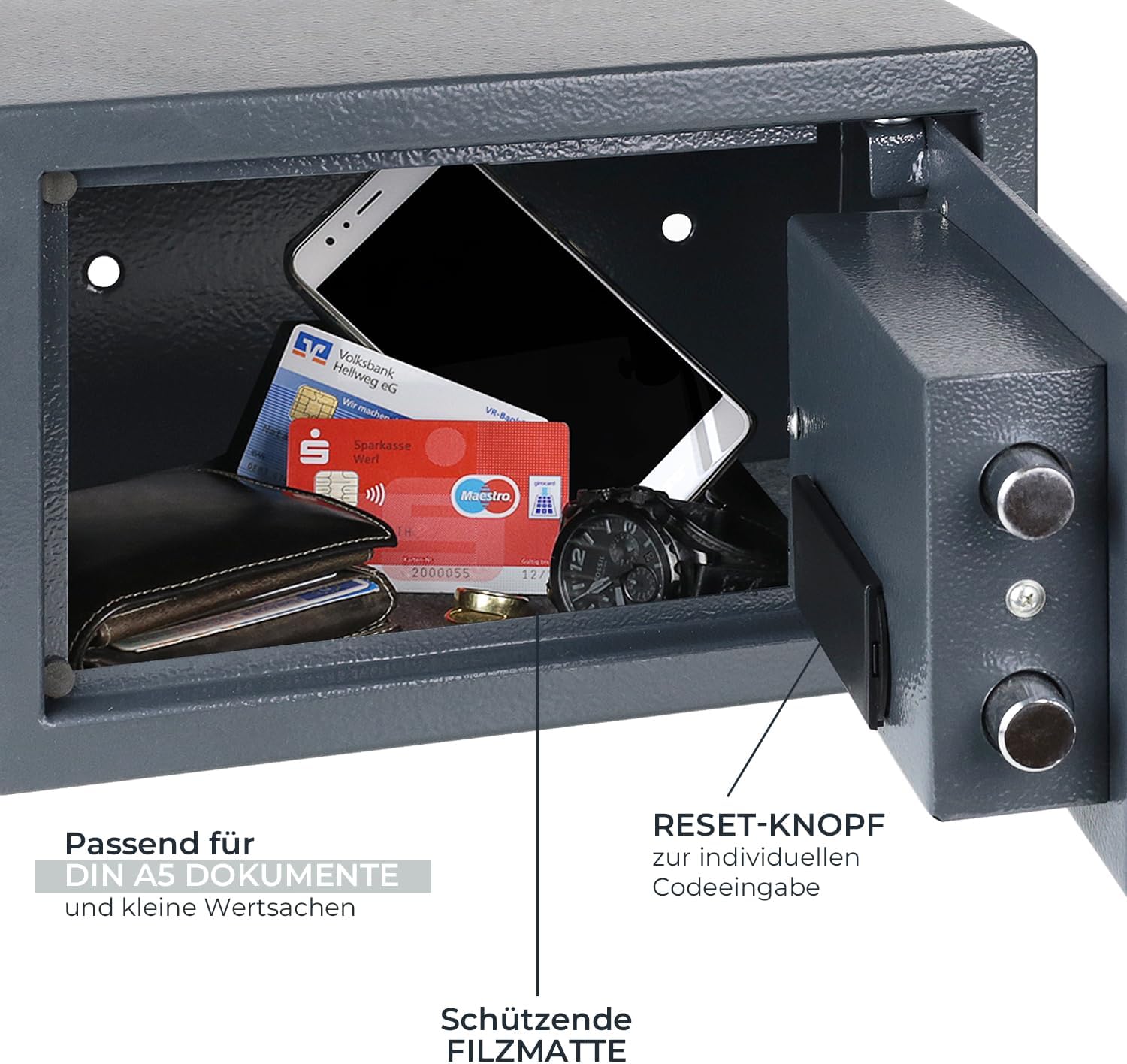 - Sicher - Safe-Tür aus 4 mm Stahl mit Doppelbolzen-Verriegelung und manuellem Schlüsselsystem zur Notöffnung