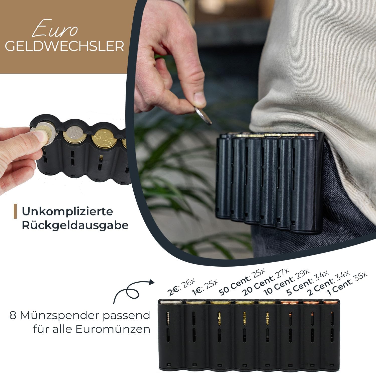 - Geldwechsler: 2 € x 26 Stk, 1€ x 25 Stk, 50Cent x 25 Stk, 50Cent x 25 Stk, 20Cent x 27 Stk, 10Cent x 29 Stk, 5Cent x 34 Stk, 2Cent x 34 Stk, 1Cent x 35 Stk