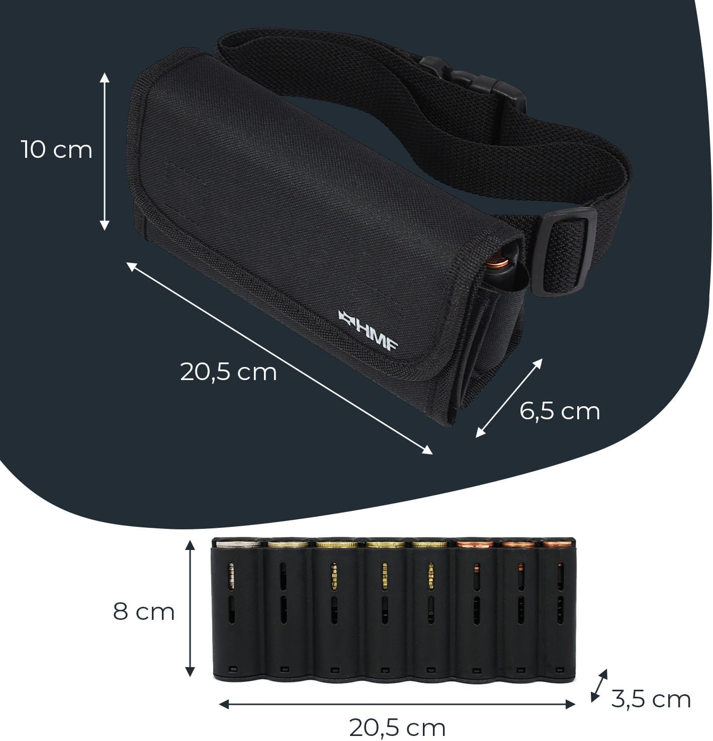 - Abmessungen der Kellnertasche, inkl. Geldwechsler: Länge: 205 mm x Breite: 65 mm x Höhe: 100 mm