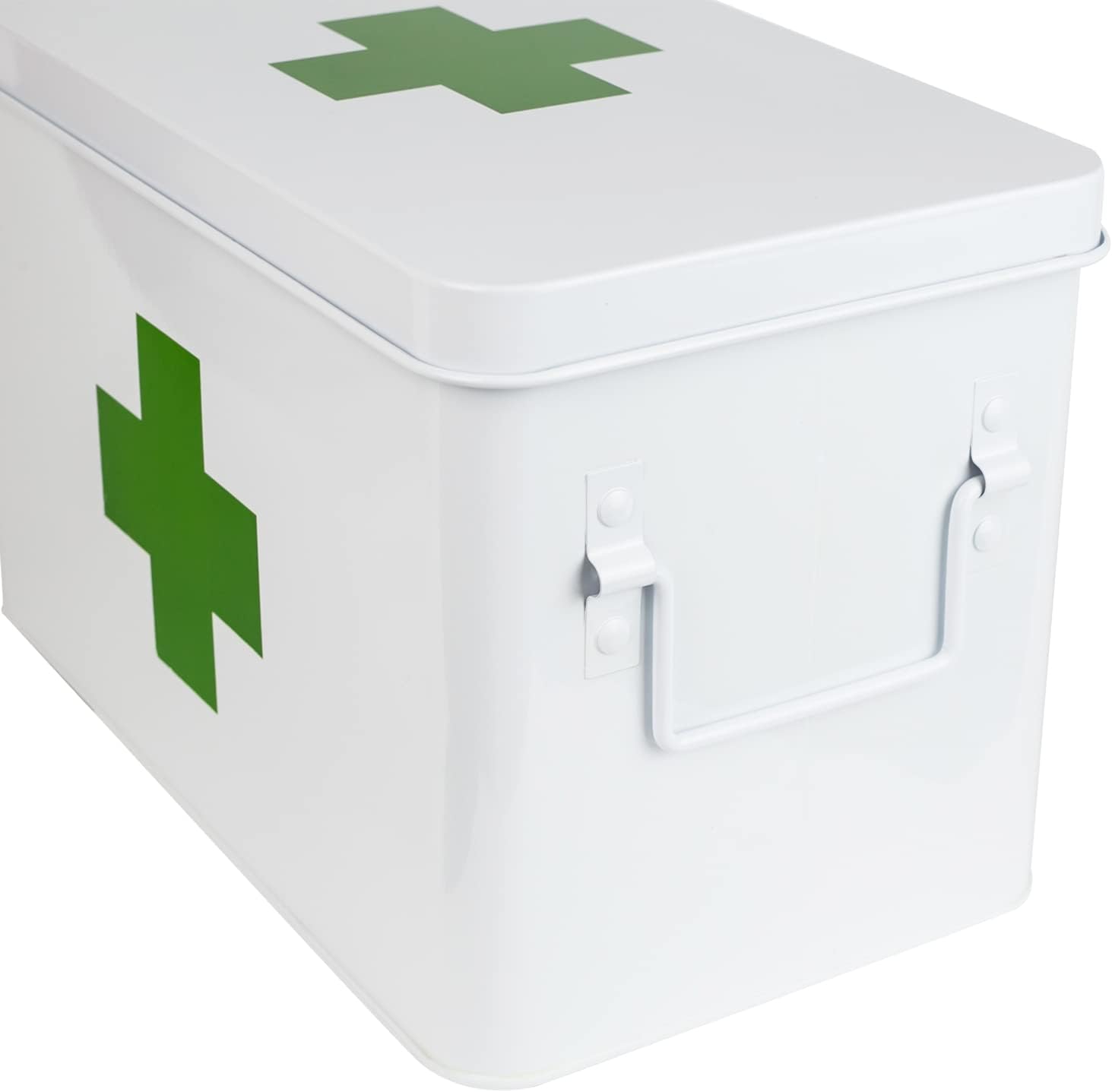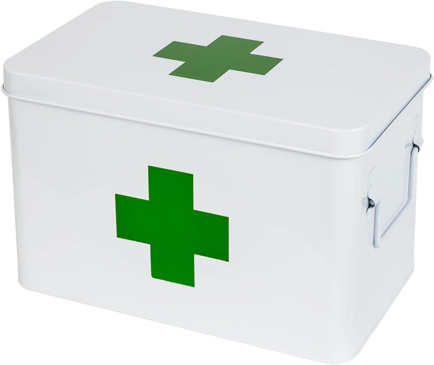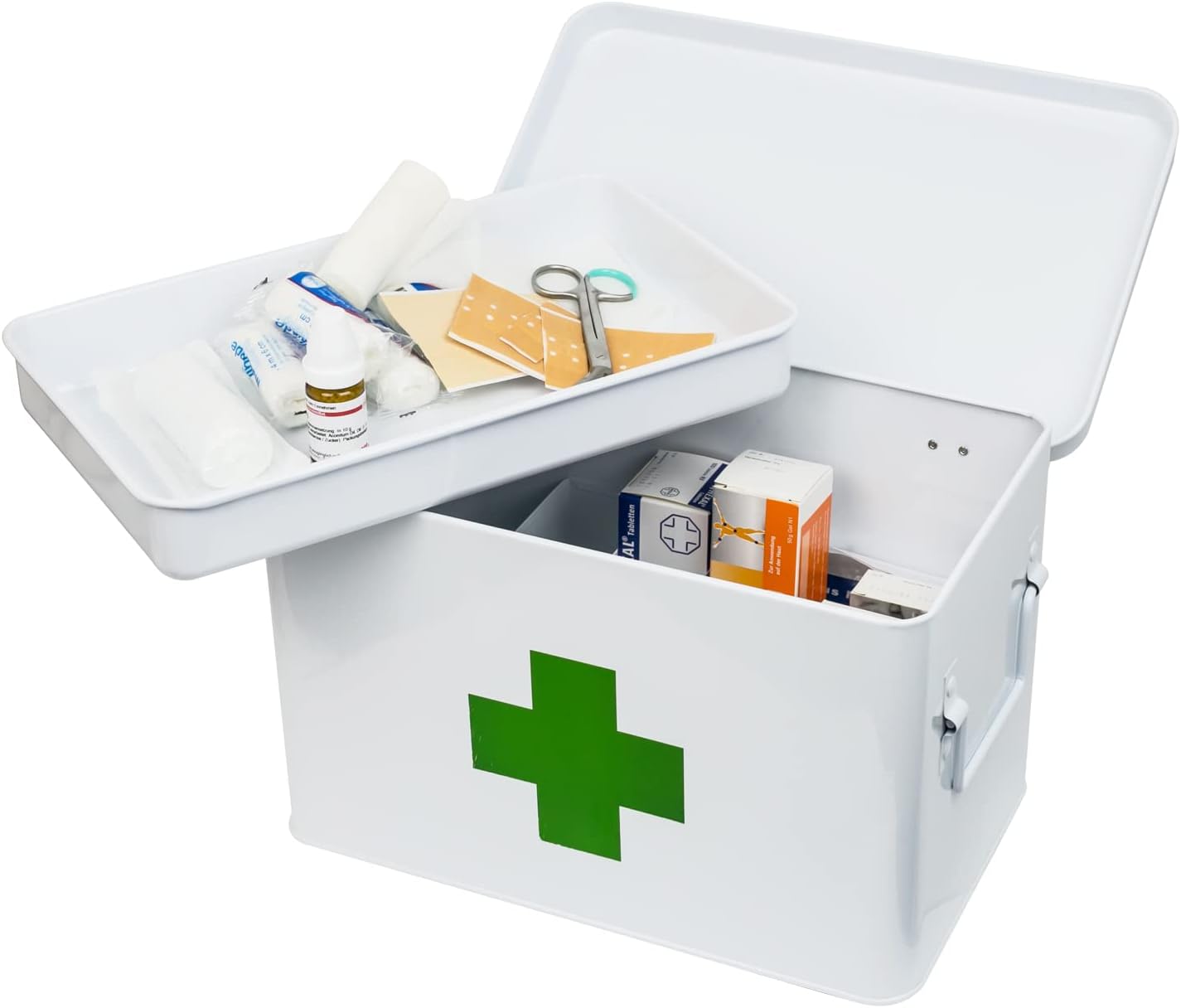 - Robust - Medizinbox aus stabilem Stahlblech in Weiss mit grünem Kreuz auf Vorderseite und Deckel