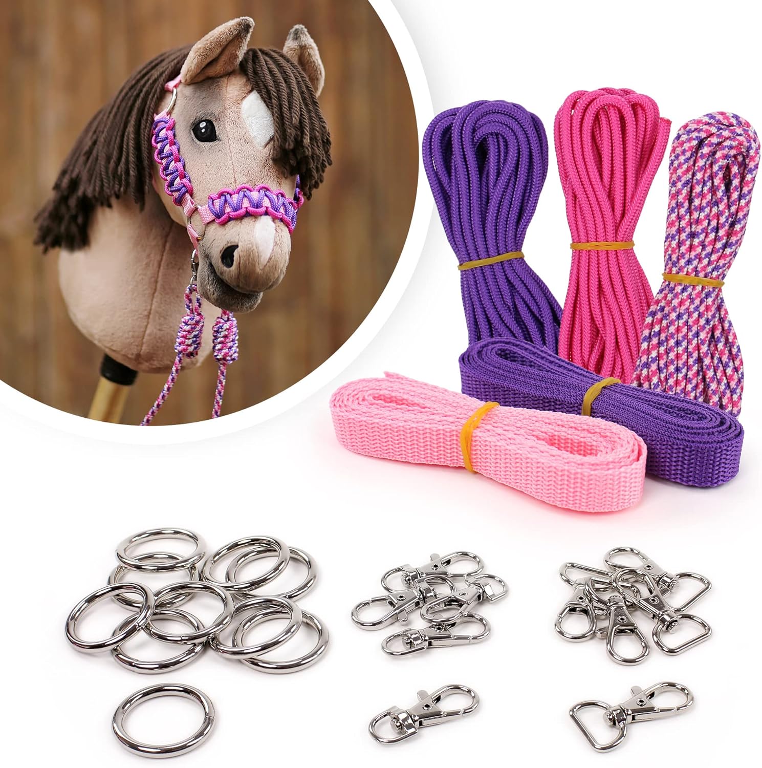 - Lieferumfang des Hobby Horse Halfter Material Sets: 2x 2 m Gurtband, Breite 1,5 cm (100% PP / Polypropylen) 3x 5 m Seil, Durchmesser 4 mm (100% PP / Polypropylen) 10x O-Ringe mit Innendurchmesser 2,5 cm, Aussendurchmesser 3,3 cm, Dicke 4 mm (aus Eisen,