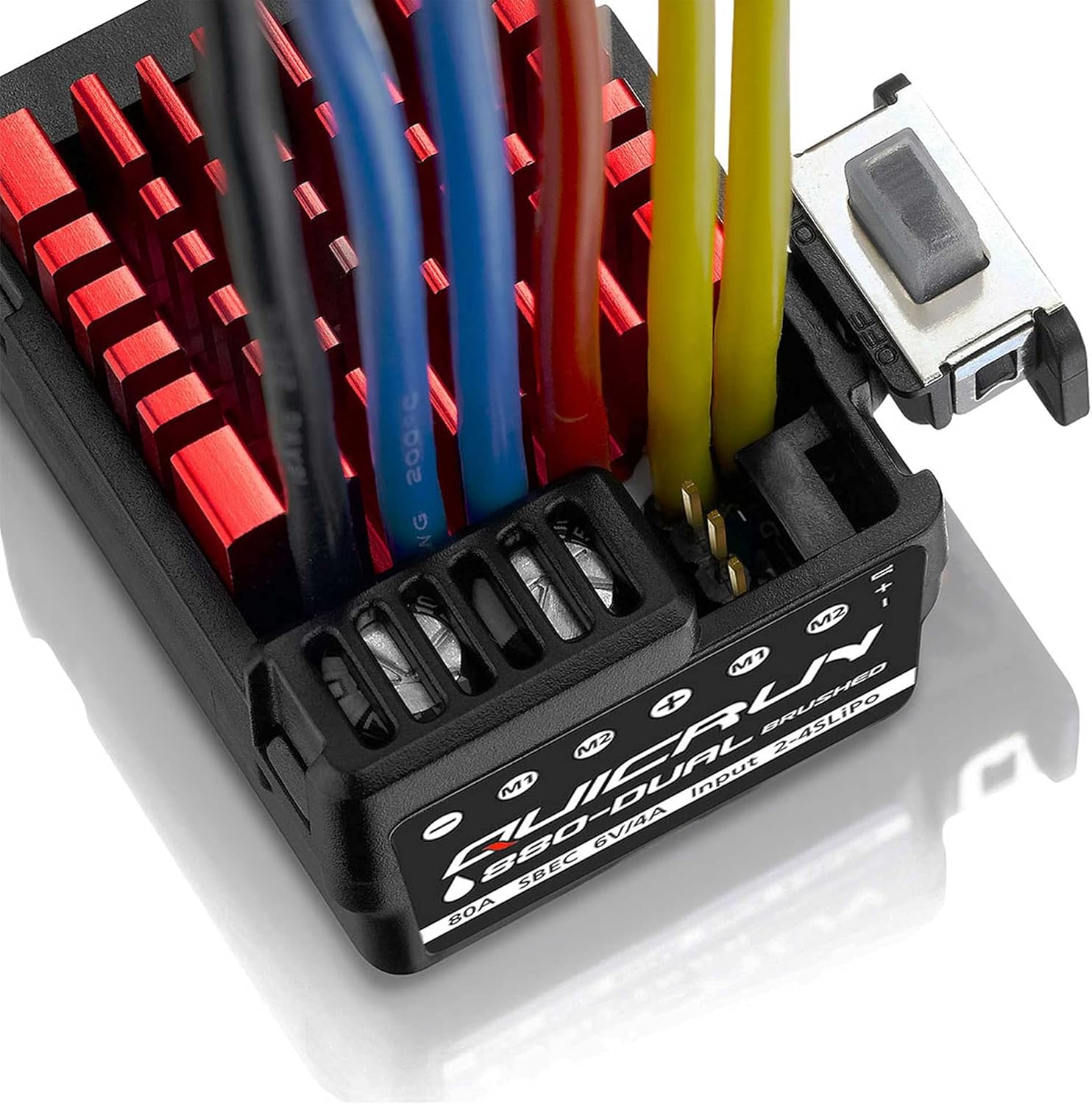 PRODUKTBESCHREIBUNGEN Der QuicRun 0880 Dual Brushed Regler hat zwei paralelle Ausgänge an denen man zwei Brushed Motoren anschliessen kann die dann synchron angesteurt werden. Für den harten Geländeeinsatz ist der Regler gegen Wasser und Staub bestens geschützt. Einstellbare PWM Frequenz, DEO Freilauftechnologie garantieren ein feinfühliges Steuerverhalten. Mit der optional erhältlichen Programmierkarte (HW30501003) stehen dem Piloten in 15 Menües über 80 verschiedene Einstellung zur optimalen Einstellung des Reglers zur Verfügung. Features: - - Ansteuerung von gleichzeitig 2 Motoren - Starkes BEC mit 6V/4A - Waterproof - 15 Menüpunkte für persönliche Reglereinstellungen - PWM Frequenz einstellbar - DEO Technik für feinfühliges und effektives Regelverhalten - Separater Programmieranschluss - Klein, leicht und trotzdem robust Technische Daten: Strom dauer/kurz: 80A/400A Zellenzahl: 2-4s LiPo / 5-12 Zellen NiMH Motor Limit 540/550: 2s LiPo, 6s NiMH: > 12T oder 18T oder 24T oder