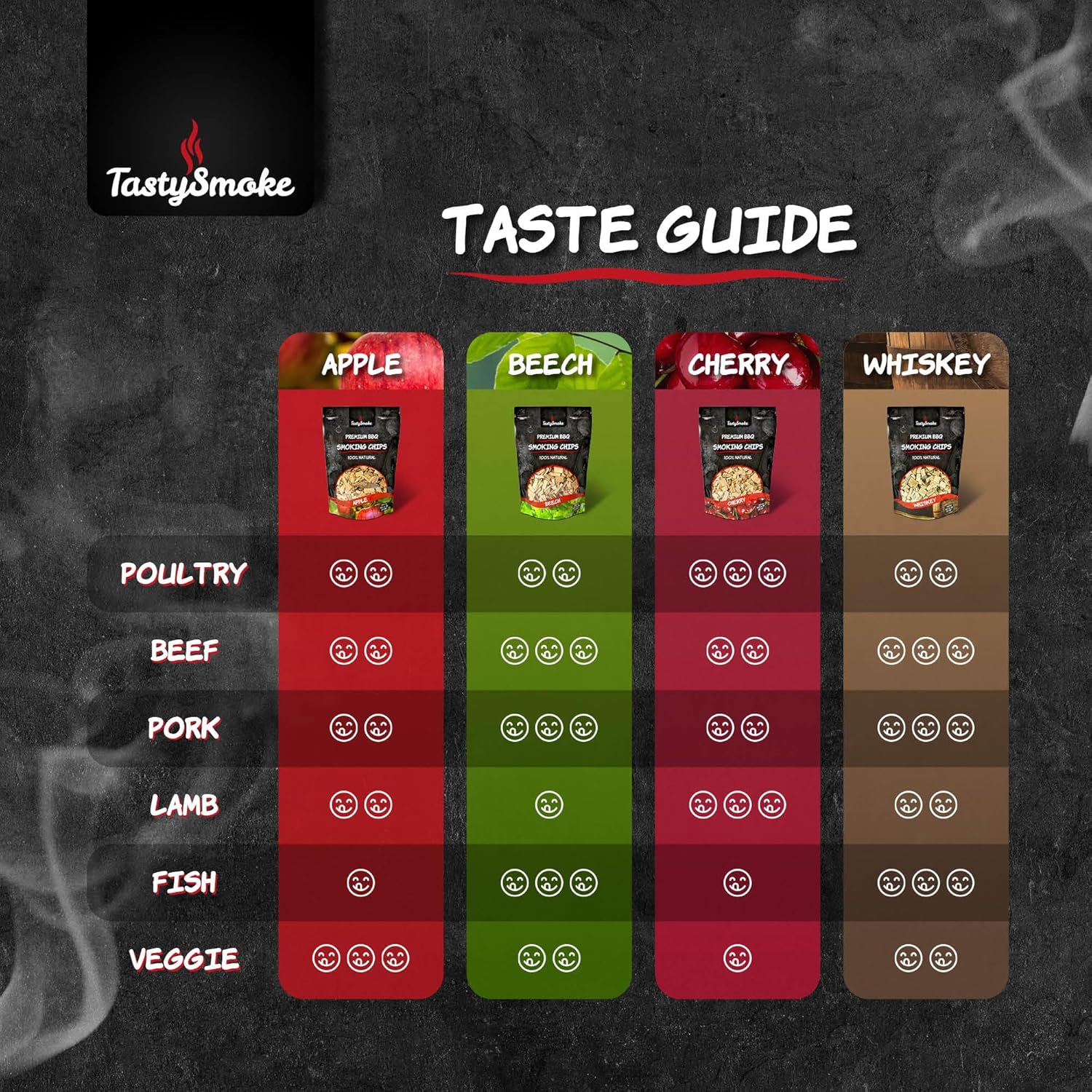 - 🍏 4 verschiedene Holzarten für unvergleichlichen Geschmack – Enthält Apfel, Buche, Kirsche und Eiche. Ideal für individuelle Aromen beim Räuchern von Fleisch, Fisch oder Gemüse.