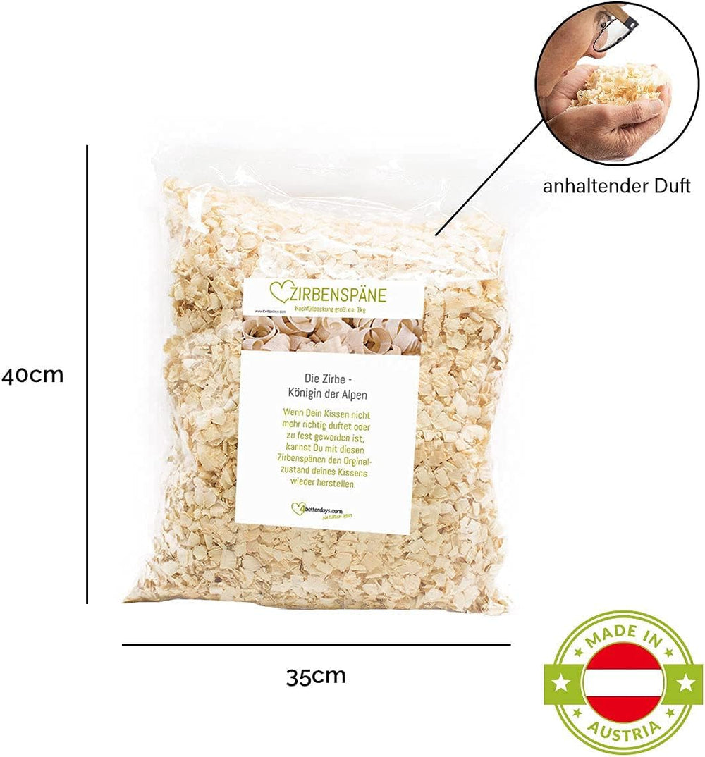 - 💚 BESCHREIBUNG: Feinste Zirbenspäne in passender Grösse für Kissenfüllungen. Damit beim Liegen auf dem Kissen nichts stört, haben wir hier kleine bis mittlere Späne gewählt, die angenehm weich sind.