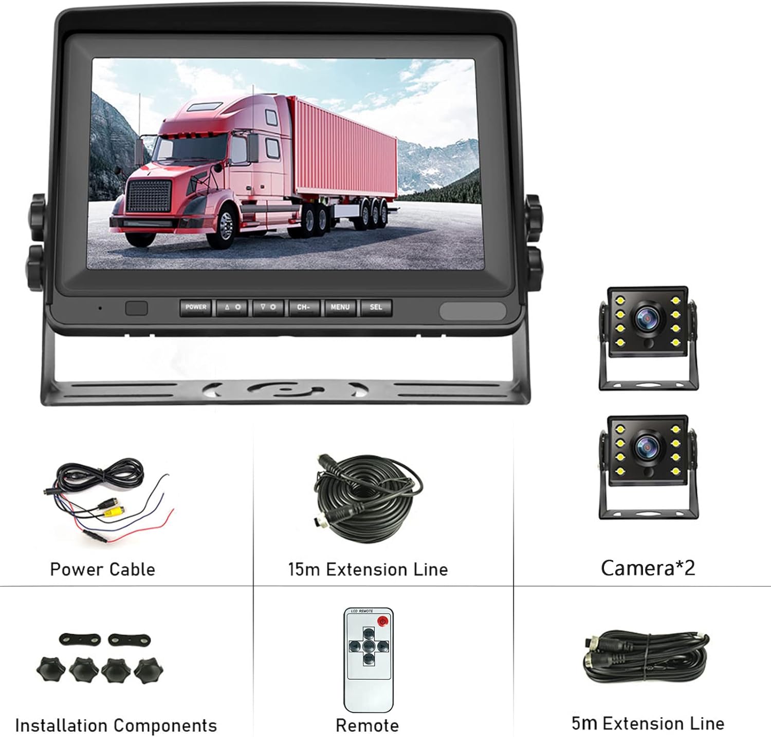 - ✔ Packungsinhalt: 1 x 8" Automonitor, 2 x Rückfahrkamera, 1 x 5 m (16.4 ft) Videokabel, 1 x 15 m (49,2 ft) Videokabel, 1 x Fernbedienung, 1 x Halterung, 1 x Sonnenschutz; Wenn Sie feststellen, dass das Produkt fehlerhaft ist oder ein Kabel anderer