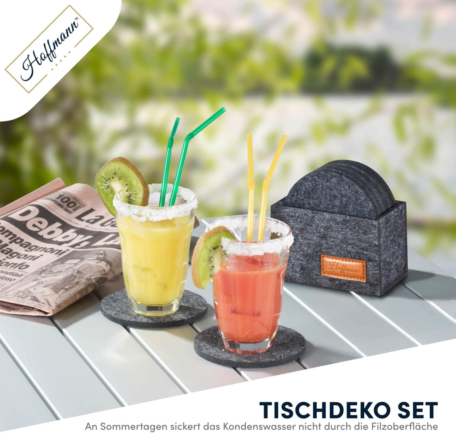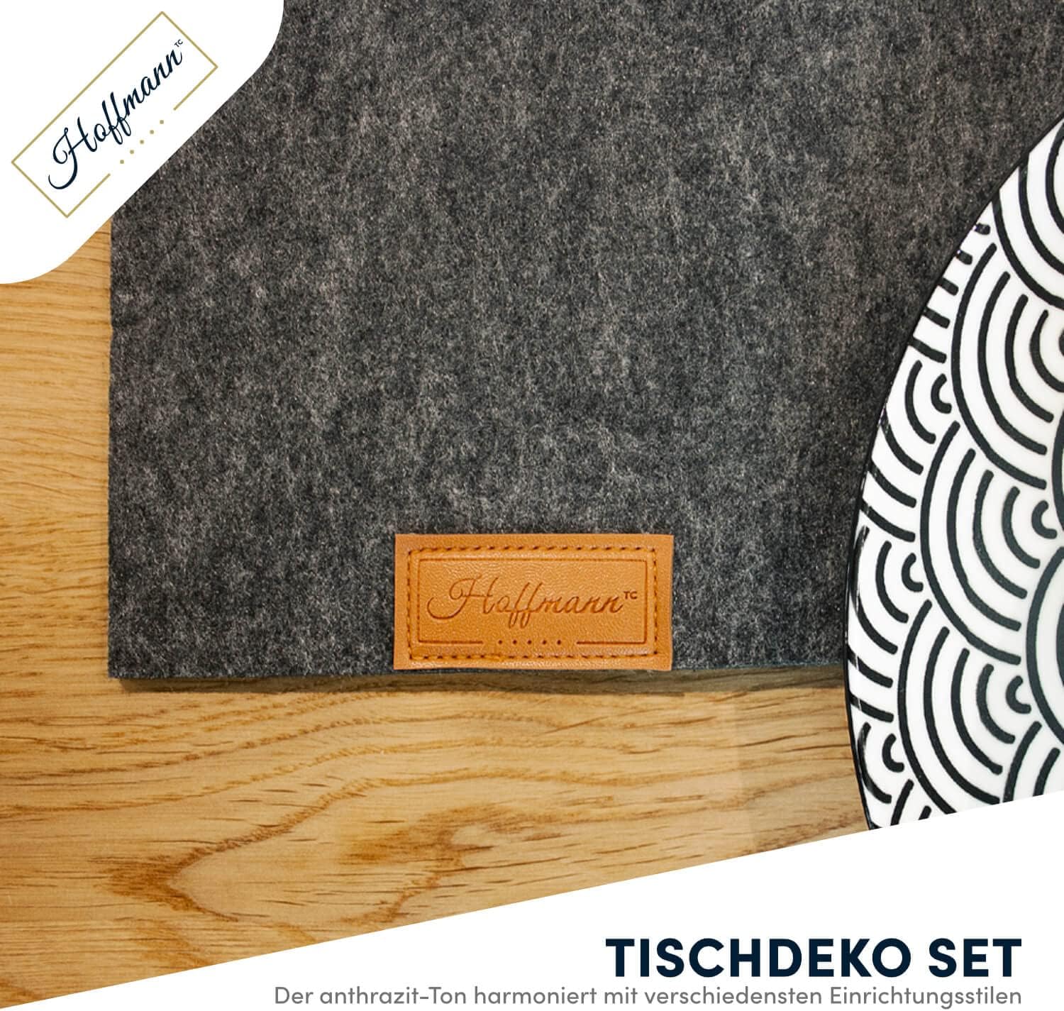 - Hoffmann Germany: Tischset Filz (6er Set 45cm x 30cm) mit geprägtem Markenlogo – inklusive Glasuntersetzern in schöner Aufbewahrungsbox (10er Set 10cm Durchm.).