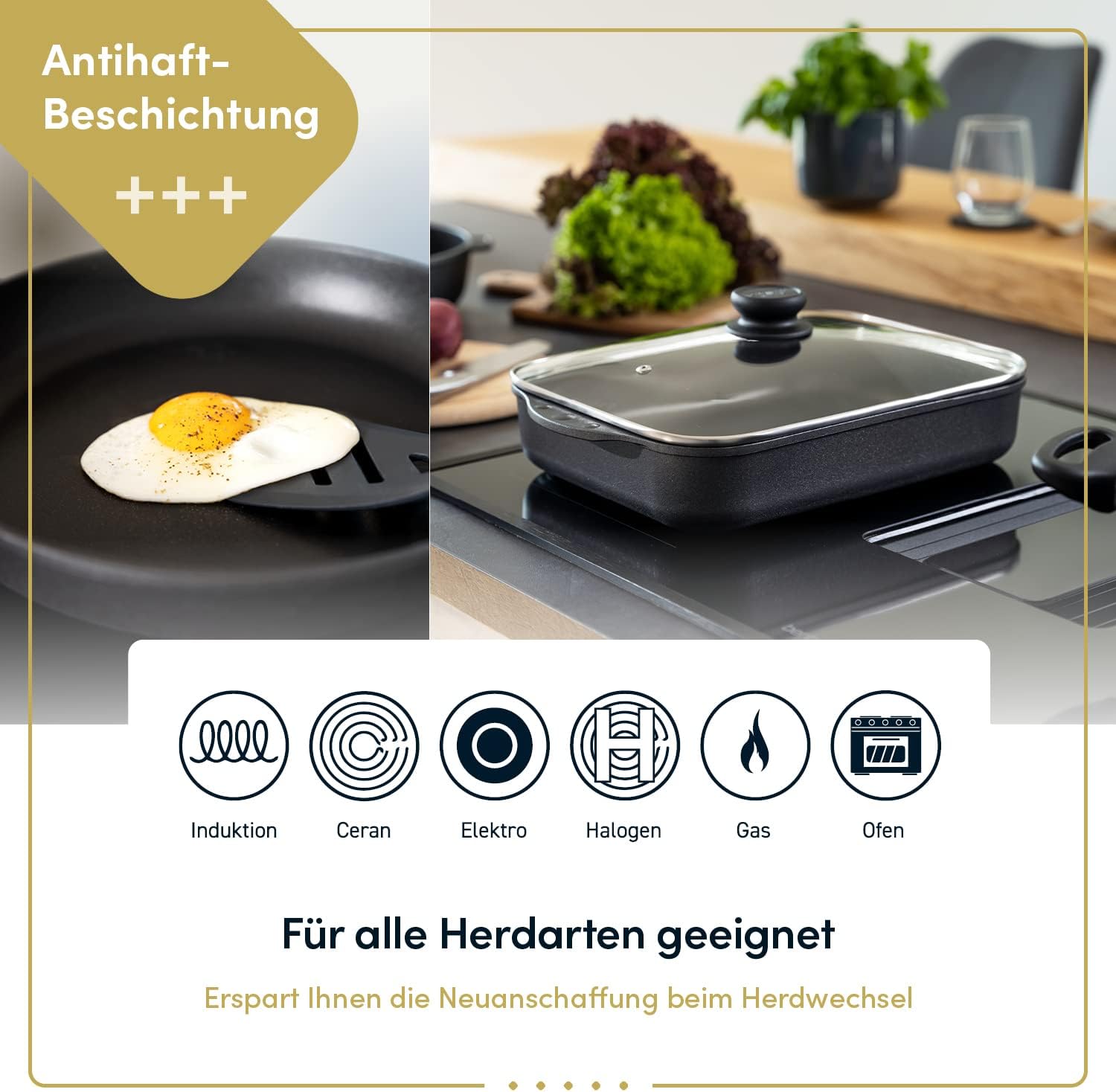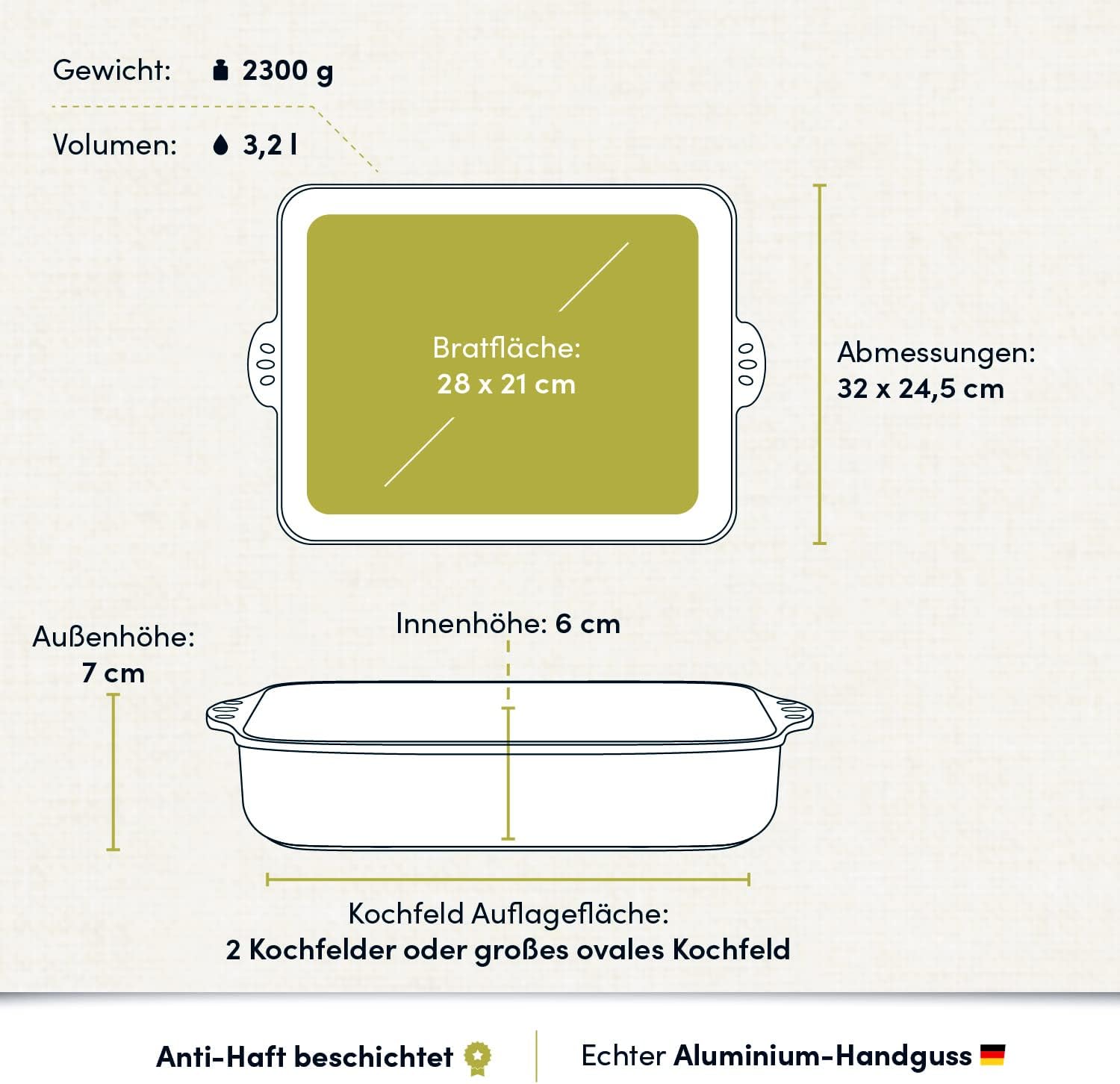 - Beste Kochergebnisse erzielen Sie dank der hervorragenden Wärmeverteilung bis in den Rand Ihr Rechteckbräter fürs Leben: Robuster Aluminium-Handguss, 100 % Made in Germany, für alle Herdarten und ein 100% verzugsfreier Boden – sonst Geld zurück.