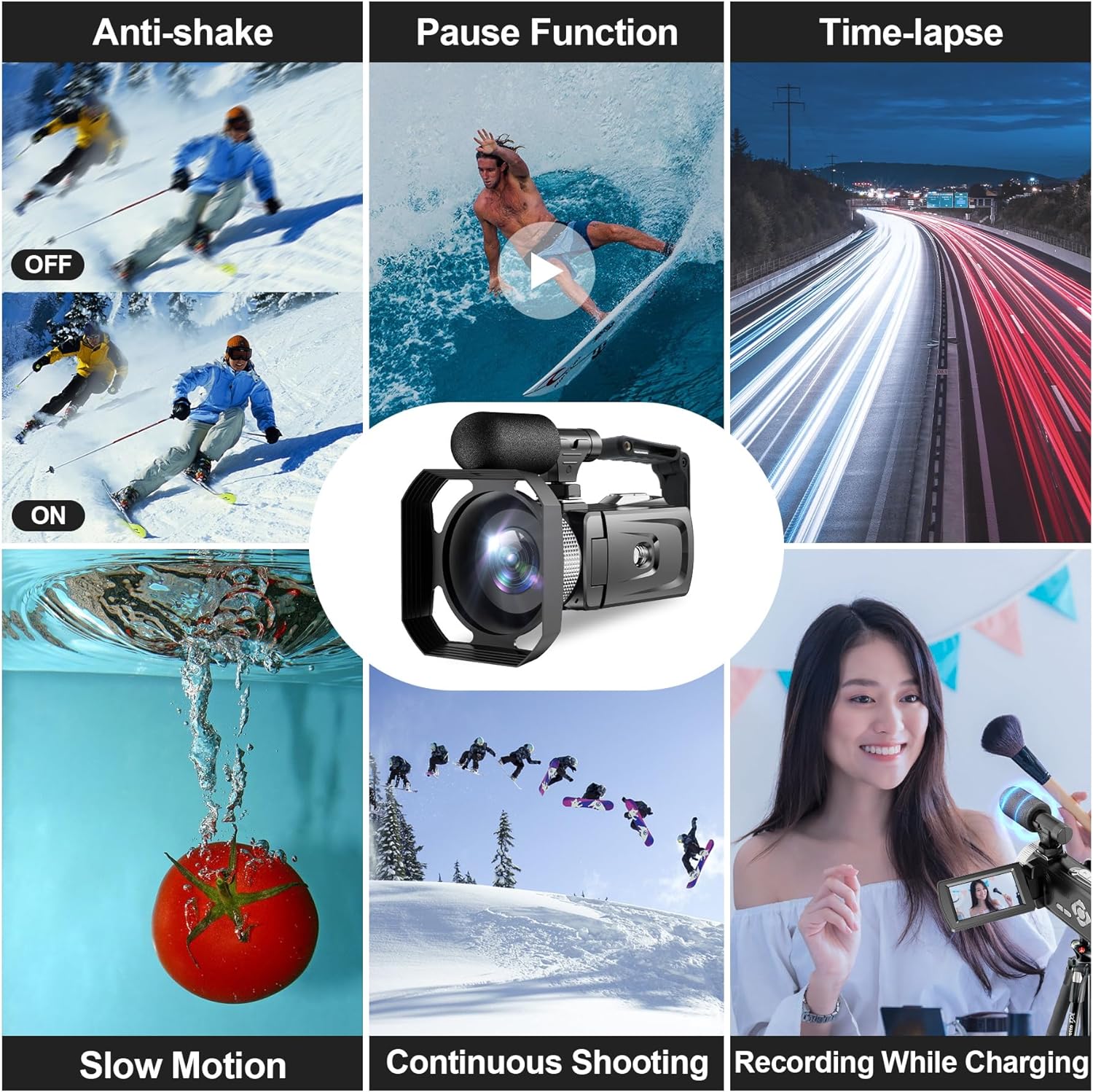 - 【Multifunktionale Camcorder】: 4K camcorder mit dem 18X Digitalzoom können Sie vergrössern und verkleinern, um entfernte Objekte klarer zu sehen. Der Camcorder unterstützt Anti-Shake, Pause-Funktion, Zeitraffer, Zeitlupe, Daueraufnahme, Auto Power