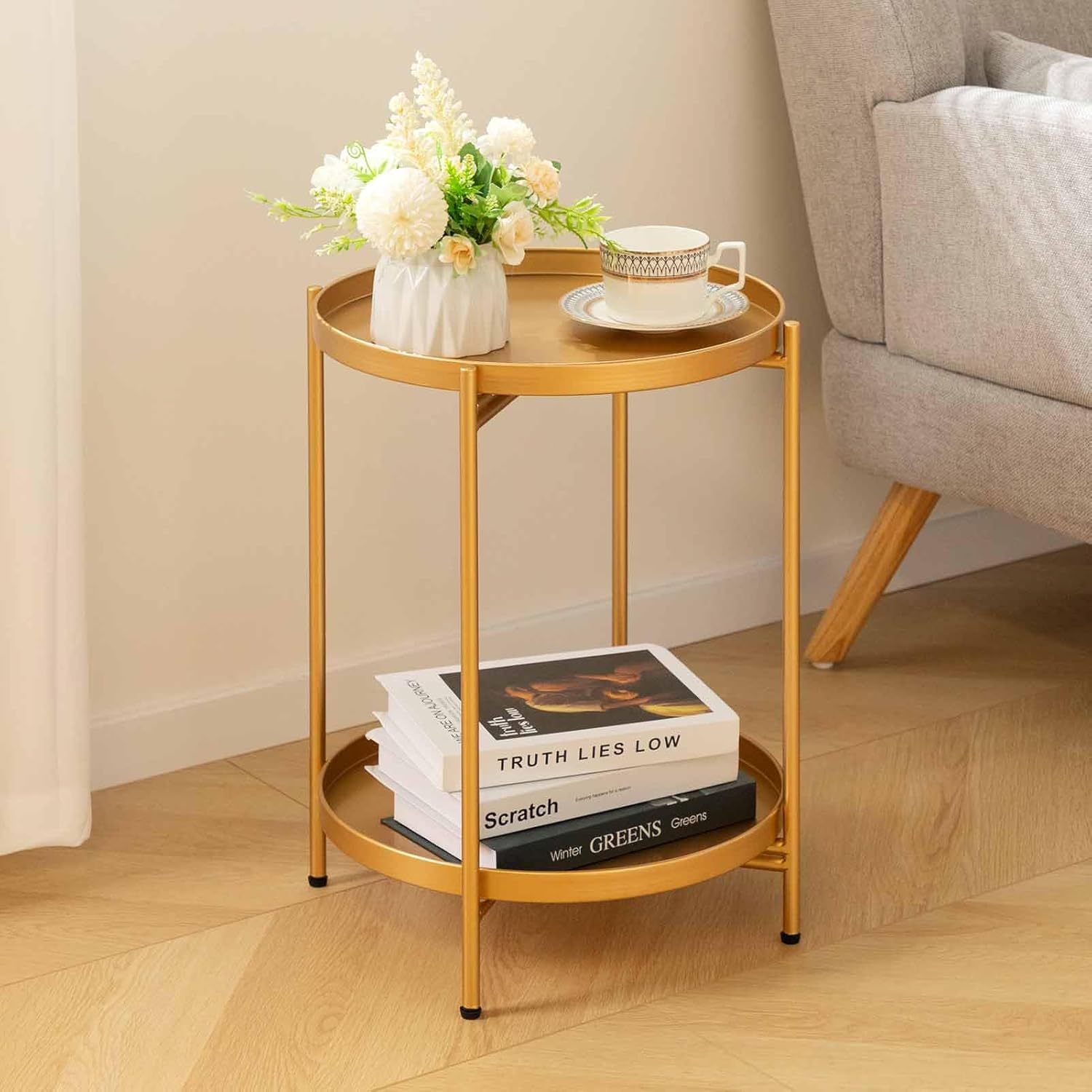 HollyHOME Runder Beistelltisch, 2 Ebenen Goldener Beistelltisch Metalltablett, Snacktisch, Couchtisc