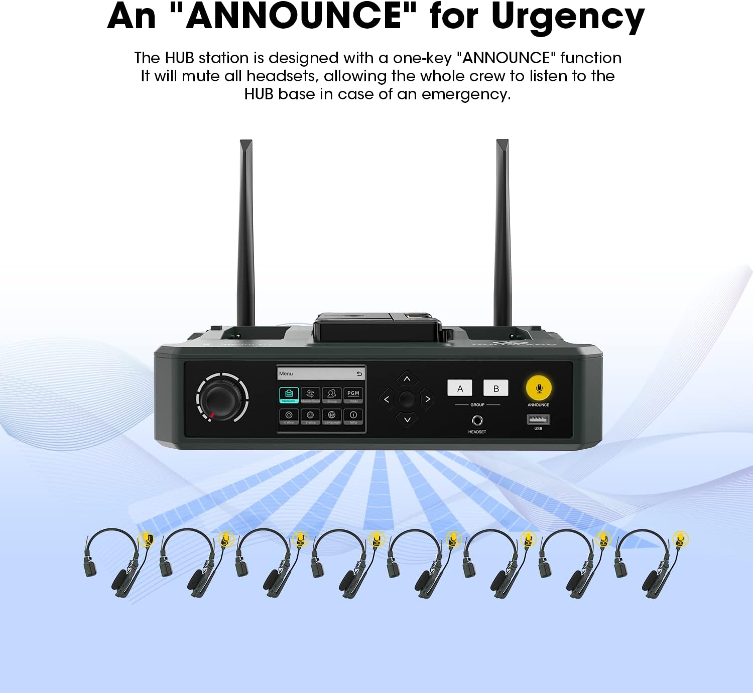 - Gruppierung AB und Ankündigung mit einem Klick. Die HUB Basis ermöglicht zwei Kommunikationskanäle für Ihr Team. Wenn Sie den HUB über ein Typ-C-Kabel an Ihren Computer anschliessen, können Sie 8 ferngesteuerte Kopfhörer in zwei A/B-Gruppen