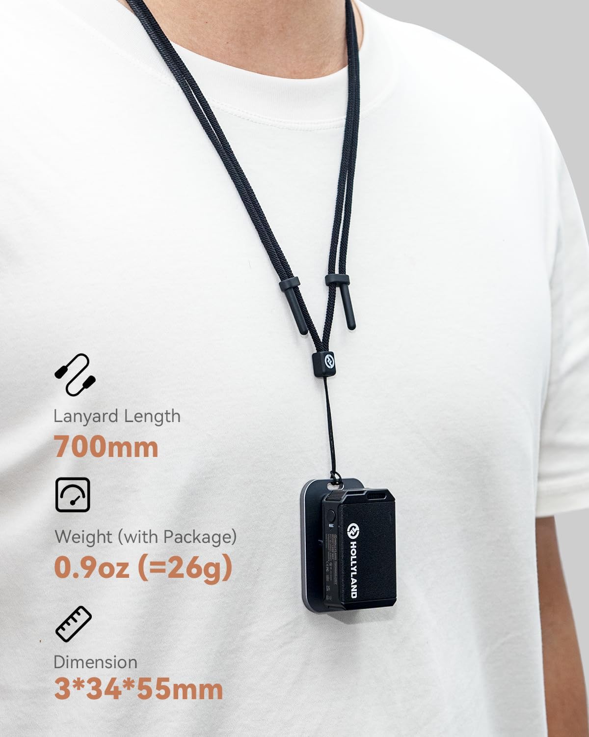 • Flexibler Tragestil. Mit diesem Schlüsselband können Sie Ihr Lark Max Mikrofon tragen, wie Sie wollen, innerhalb oder ausserhalb Ihrer Kleidung.