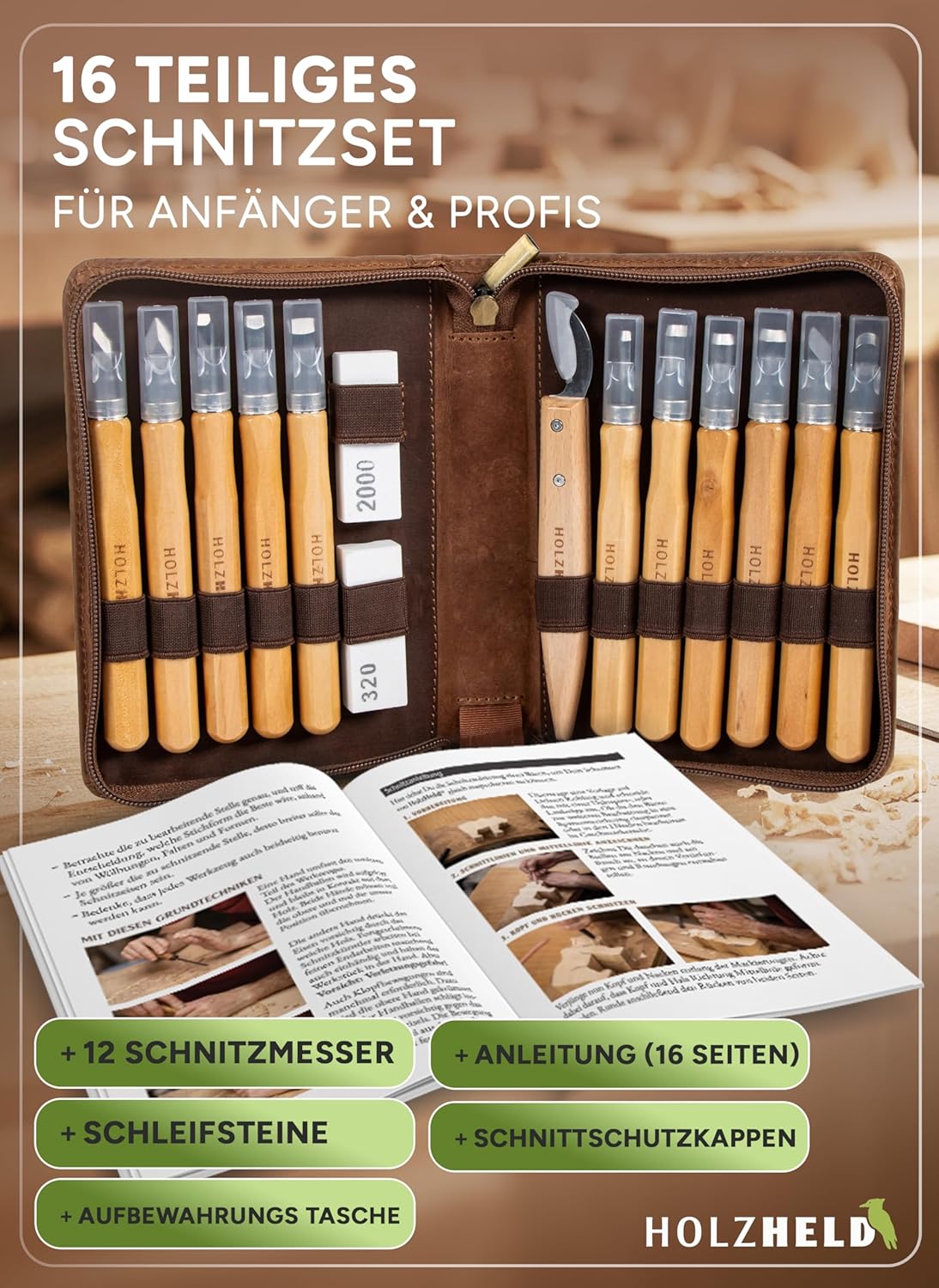 HOLZHELD Schnitzwerkzeug -Set (16-teilig) in hochwertig verarb. Ledertasche. Schnitzset mit hochwert