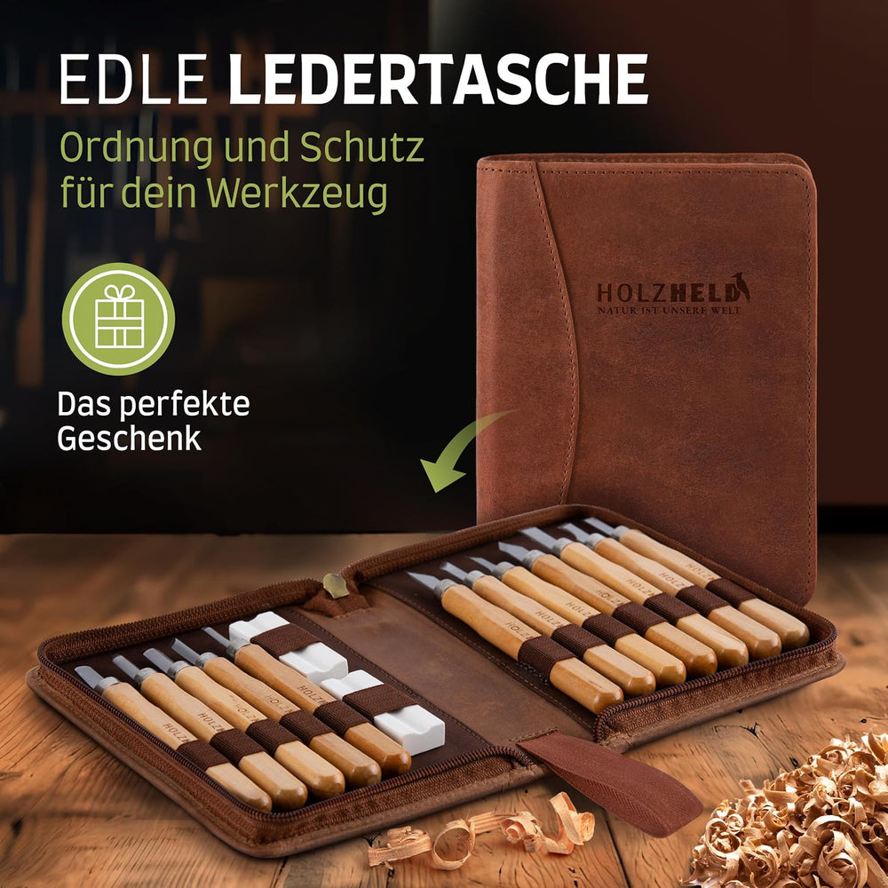 HOLZHELD Schnitzwerkzeug und Schnitzrohling (17-teilig) in hochwertiger Ledertasche. Inkl. Anleitung