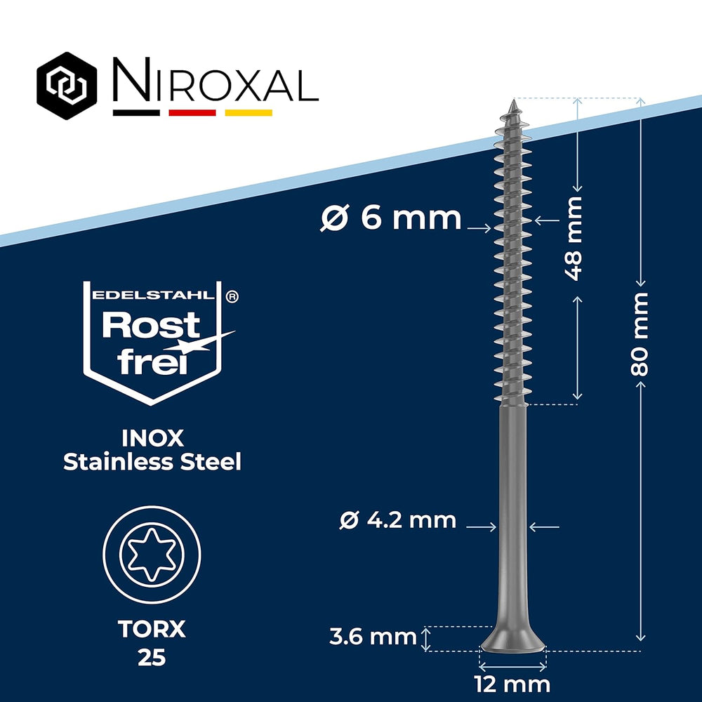 - Das hochwertige Schraubensortiment von NietFullThings wird stetig erweitert. Unsere qualitätsgeprüften Edelstahl Holzschrauben 80mm torx werden regelmässig von uns verbessert, um stets eine ausgezeichnete Qualität zu gewährleisten. Hochwertiger,