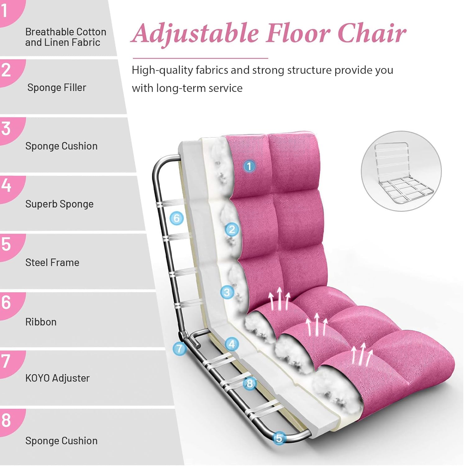 - 🛋️~Verstellbare Rückenlehne~Die Rückenlehne dieses Bodenstuhls lässt sich in 14 Positionen verstellen, so dass Sie den richtigen Winkel nach Ihren Bedürfnissen wählen können, um sich bequemer anlehnen zu können.