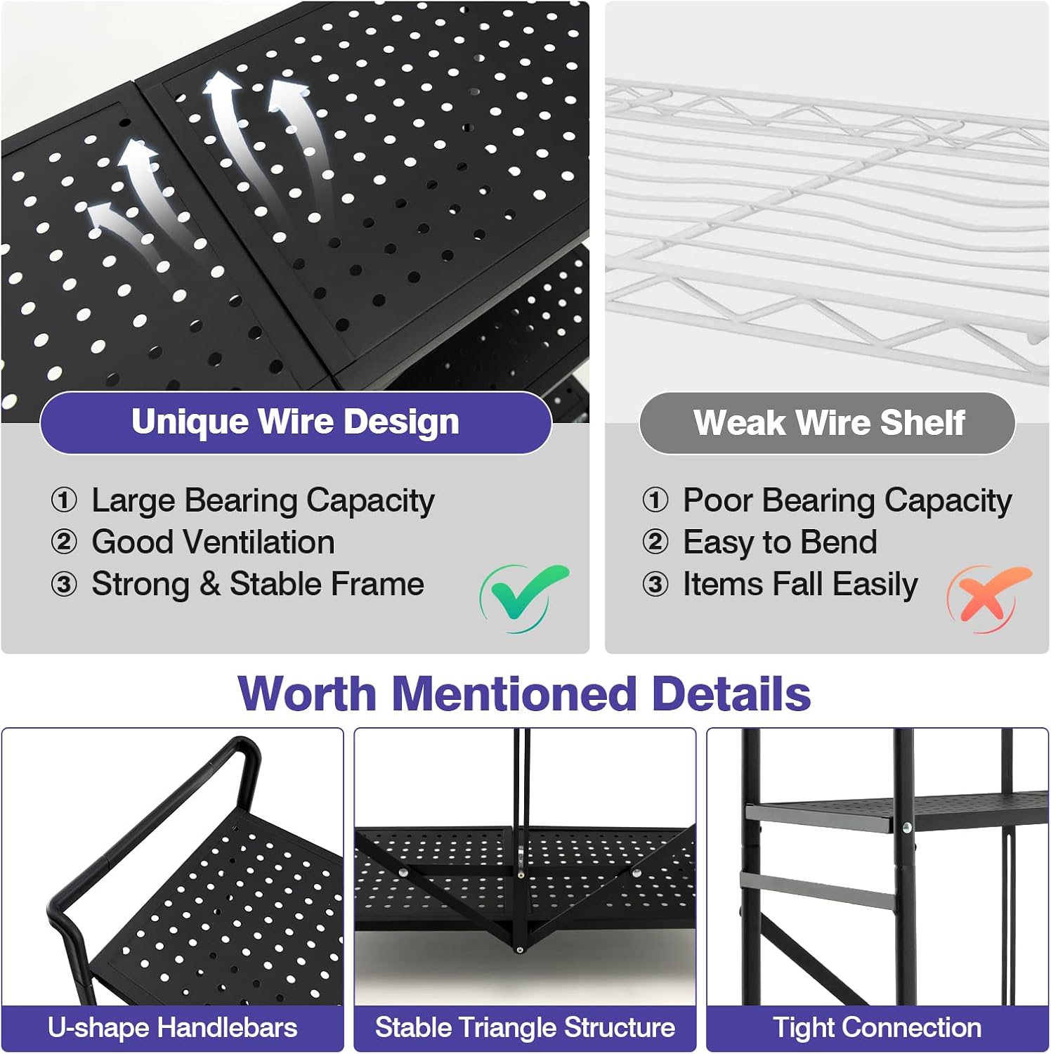 - ATMUNGSAKTIVE METALLGITTEREINLEGEBÖDEN: Die Metallgittereinlegeböden des Küchenregals sind so konzipiert, dass sie atmungsaktiv und gut belüftet sind und die Gegenstände effektiv vor Feuchtigkeit schützen. Jede Ebene hat einen Abstand von 34 cm, so