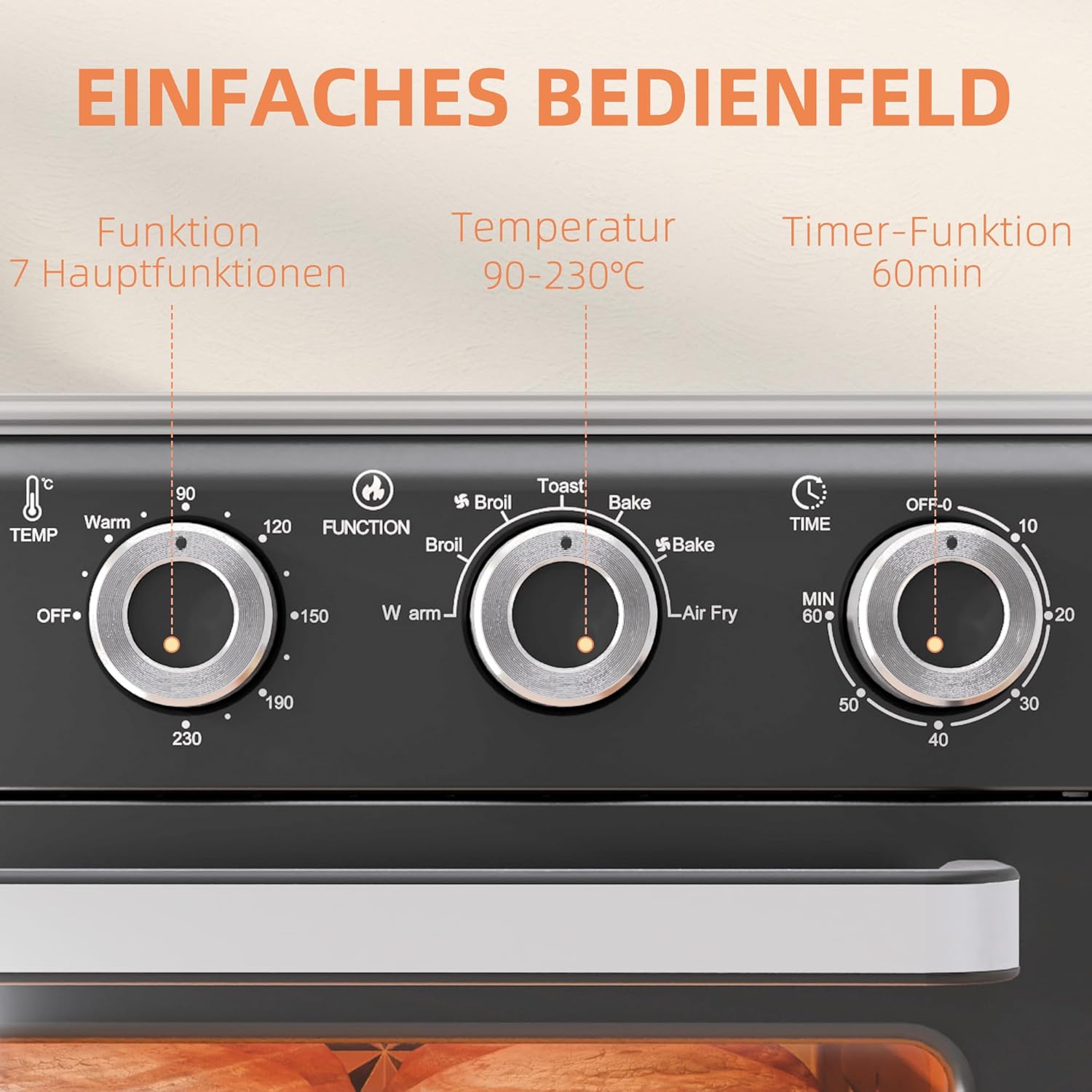 • Individuelle Temperatureinstellung: Passen Sie die Temperatur des Minibackofens von 90-230 °C und die Garzeit von 0 bis 60 Minuten ganz nach Ihren Wünschen an. So gelingt Ihnen jedes Gericht perfekt – ob nun zartes Gemüse oder knuspriges Brot.