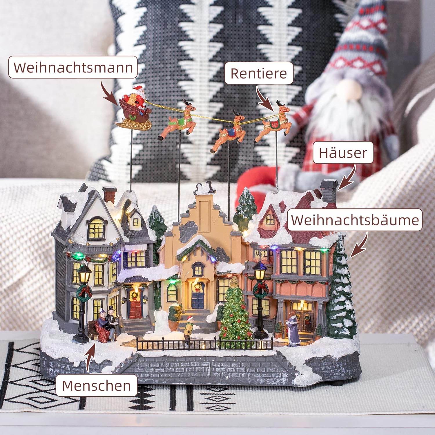 - Weihnachtslandschaft: Dieses verschneite, beleuchtete Weihnachtsdorf enthält drei Häuser, Weihnachtsbäume, den Weihnachtsmann, Rentiere, Schlitten, Menschen und viele weitere Details.