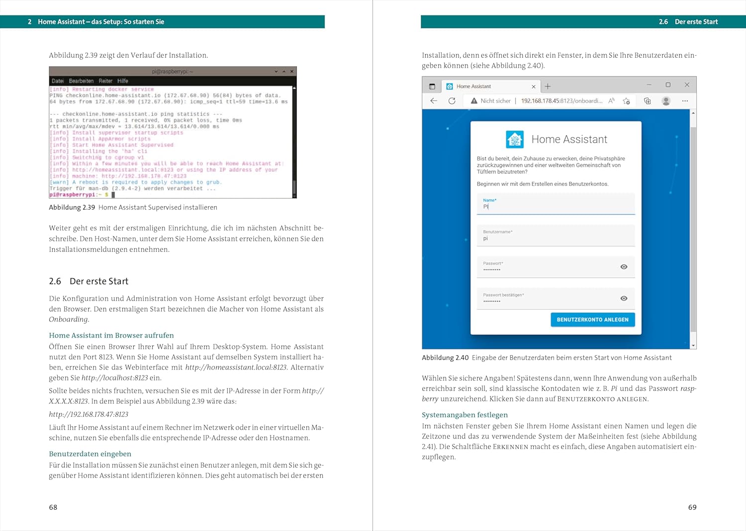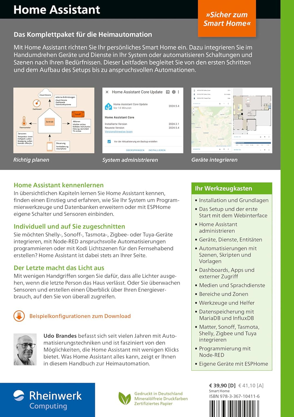 So gestalten Sie Ihr indviduelles Smart Home! Home Assistant ist Ihr Begleiter auf dem Weg zum eigenen Smart Home. Im Handumdrehen integrieren Sie Geräte und Dienste in Ihr System und automatisieren Schaltungen und Szenen ganz nach Ihren Bedürfnissen. Udo Brandes beschreibt alle Schritte, die Sie für Ihr eigenes Smart Home benötigen, von der Einrichtung über die Verwaltung bis hin zur Automatisierung. So erfahren Sie in übersichtlichen Kapiteln zum Nachschlagen, wie Sie den Home Assistant um Datenbank- und Programmiermöglichkeiten erweitern, mit ESPHome eigene Schalter und Sensoren einbinden und daraus ein Komplettpaket für die Heimautomation schnüren. Neu in der 2. Auflage: Ein Ausblick auf den neue Matter-Standard zur Heimautomation und die Einrichtung einer Home-Assistant-Installation auf Proxmox. . Aus dem Inhalt:Das Setup und der erste Start: das WebinterfaceHome Assistant administrierenGeräte, Dienste, EntitätenAutomatisierungen mit Szenen, Skripten und VorlagenDashboards, Apps und externer ZugriffMedien und SprachdiensteBereiche und ZonenWerkzeuge und HelferDatenspeicherung mit MariaDB und InfluxDBSonoff, Tasmota, Shelly und Tuya integrierenProgrammierung mit Node-REDEigene Geräte mit ESPHomeDie Fachpresse zur Vorauflage:. henrikheigl.de: »Damit ist der Einstieg und die Administration der eigenen Home Assistant Umgebung kein Problem mehr. Ein gutes und Praxisnahes Arbeitsbuch für das eigene Smart Home.« Mehr lesen