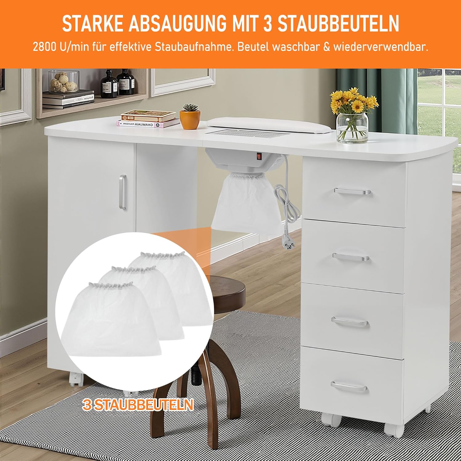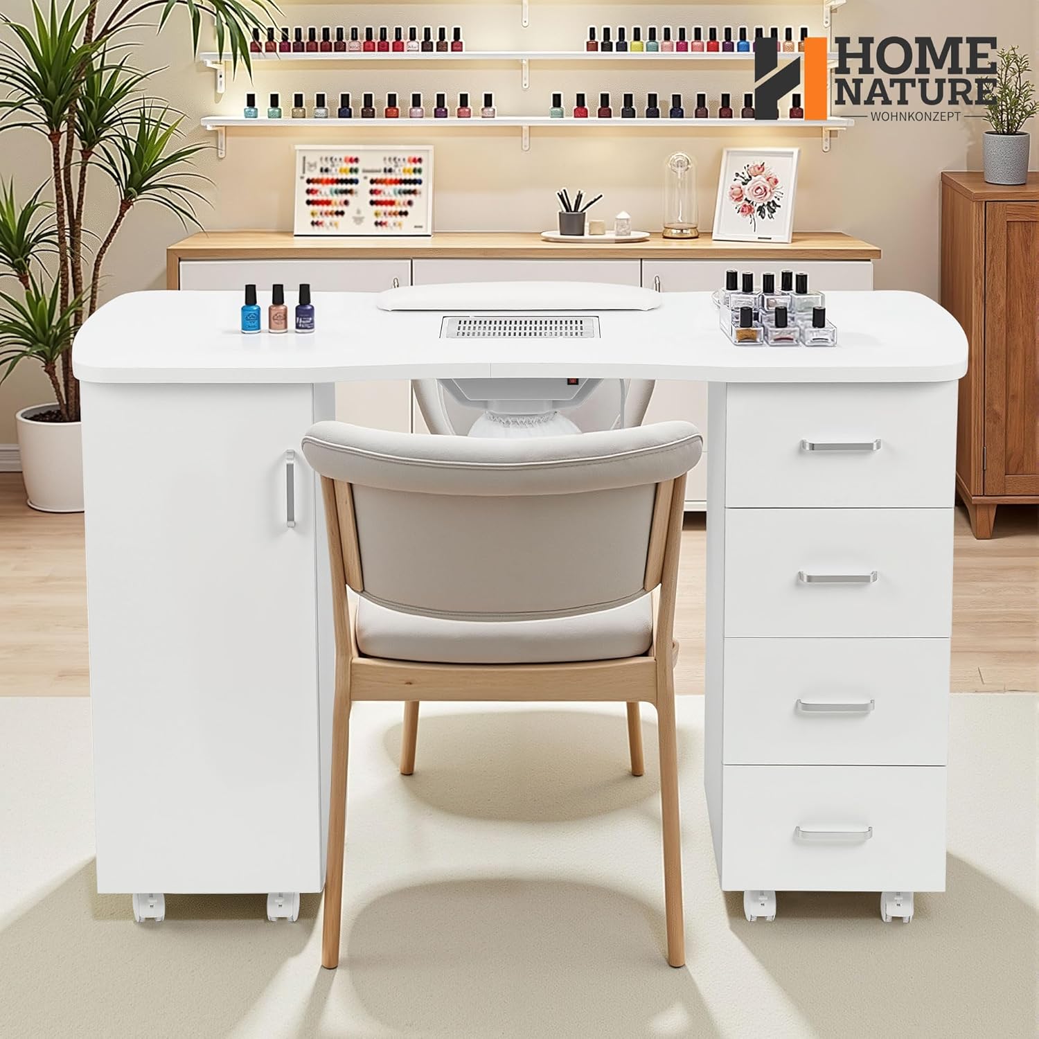 - Komfortable und praktische Konfiguration: Ausgestattet mit Handauflagen für mehr Komfort während des Maniküreprozesses und Rollen für einfaches Bewegen und Fixieren.