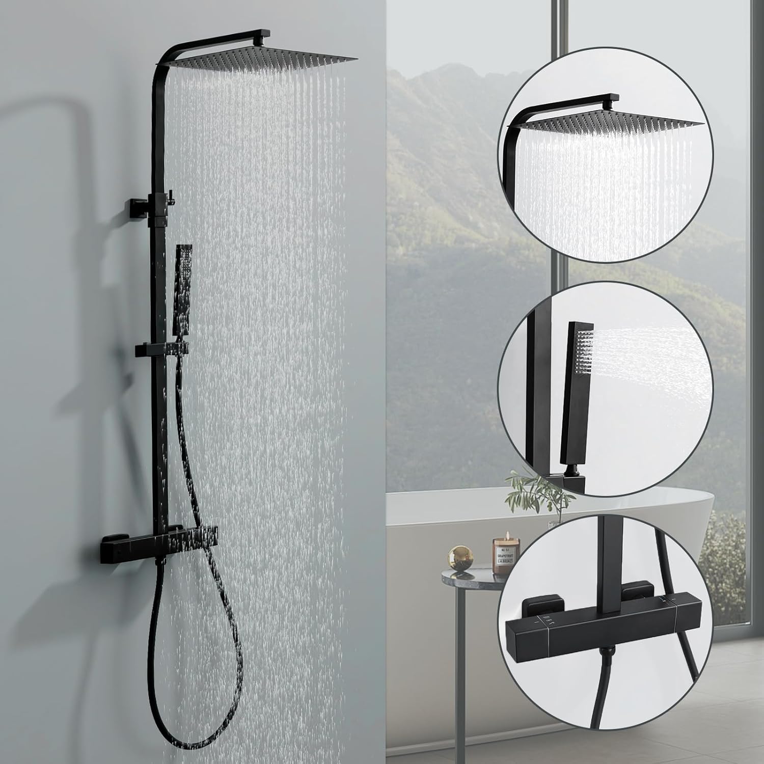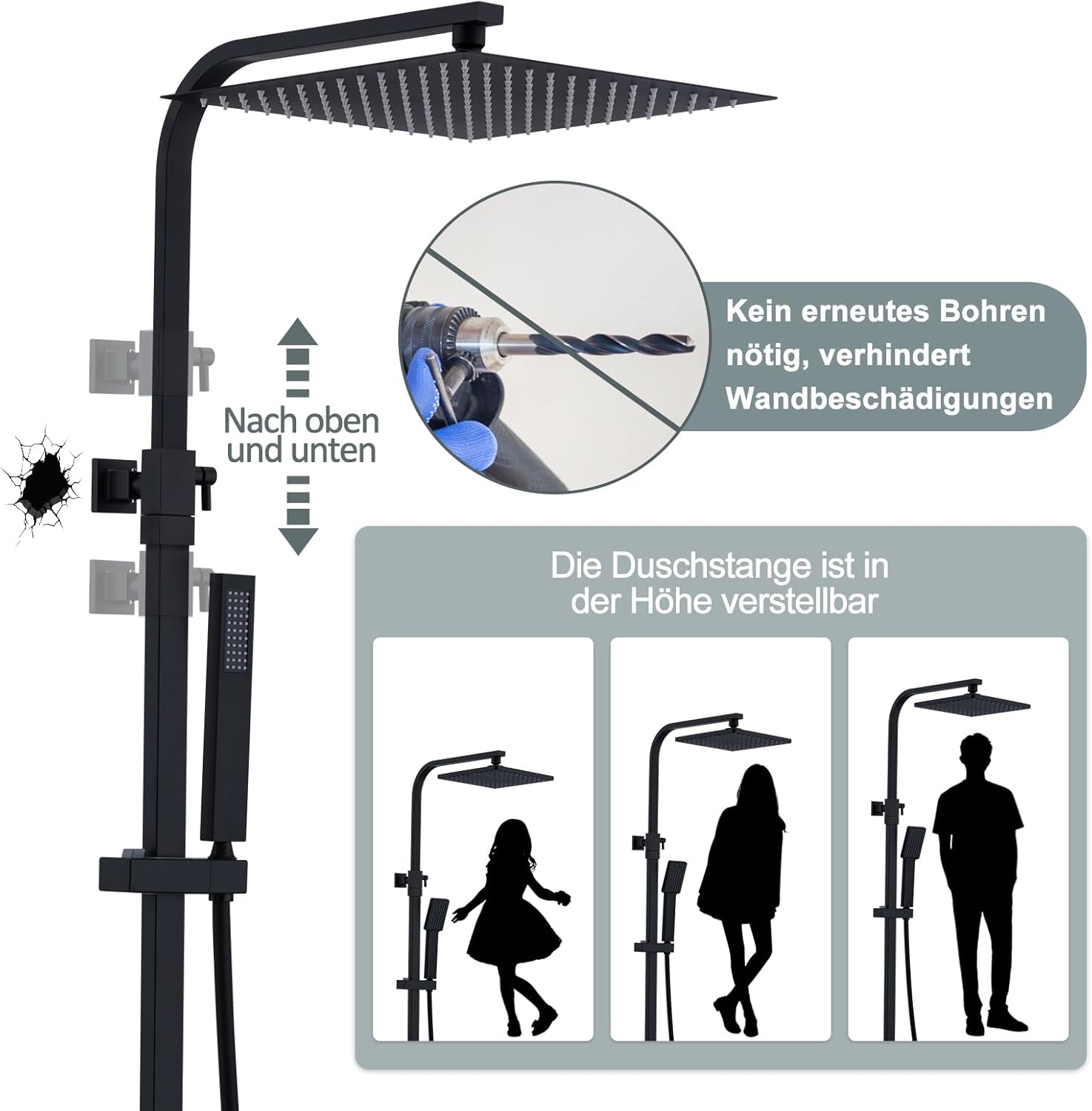 - 【Modernes Design mit durchdachten Details】Stilvolles Duschsystem Schwarz mit Thermostat in kantigem, elegantem Design – die höhenverstellbare Wandhalterung lässt sich vor der Installation flexibel an bestehende Bohrlöcher anpassen, ohne Ihre